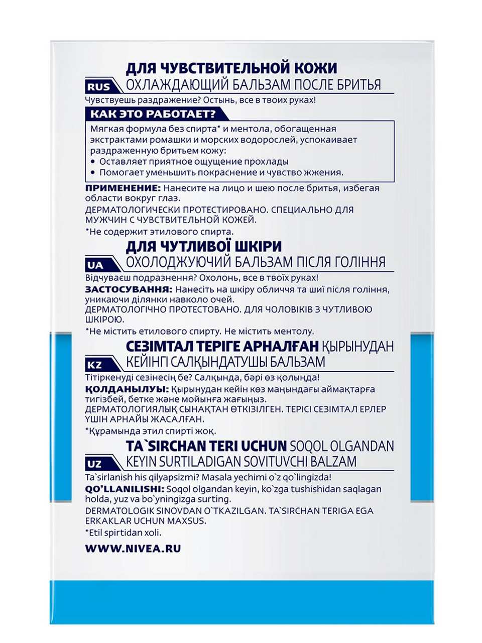 Бальзам после бритья охлаждающий Nivea Men для чувствительной кожи, без содержания спирта, 100 мл.
