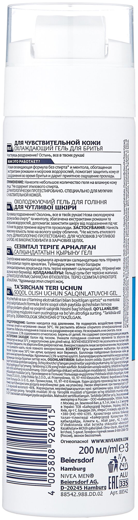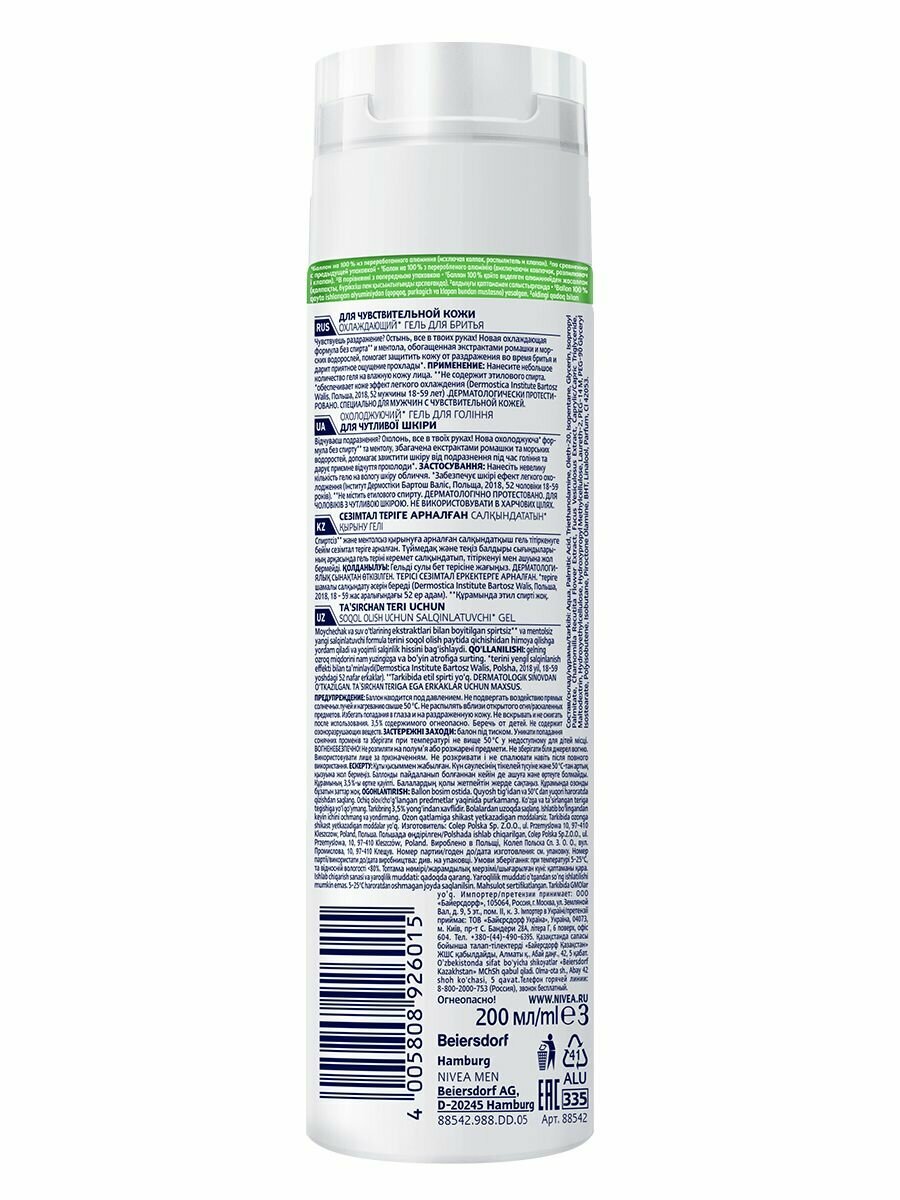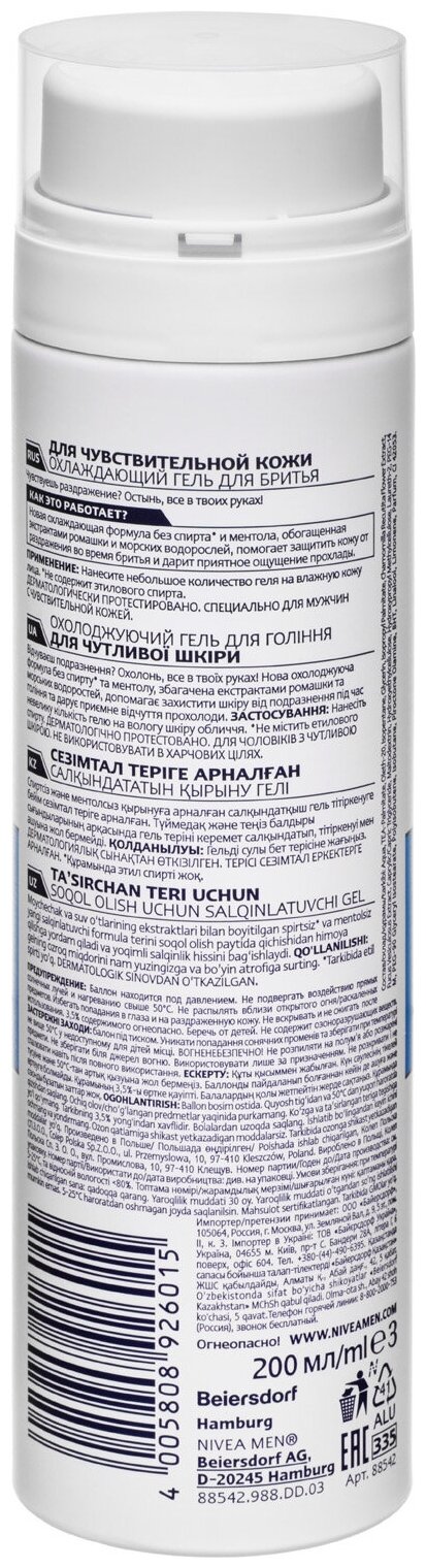 Гель для бритья охлаждающий NIVEA MEN для чувствительной кожи без спирта, 200 мл