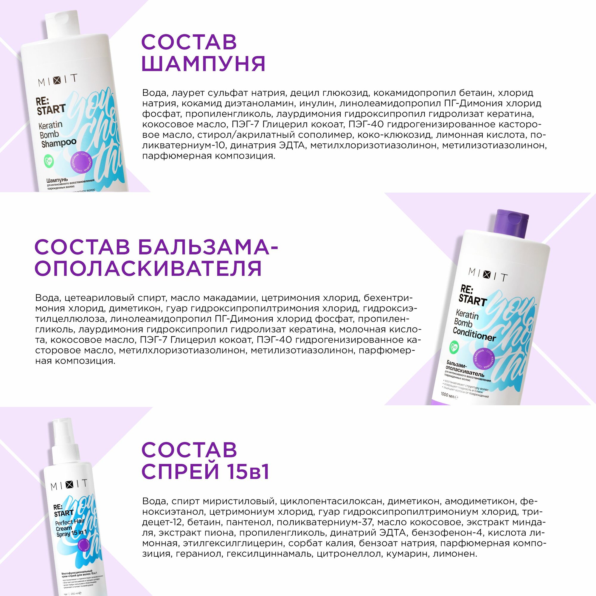 MIXIT Профессиональный набор косметики: шампунь для волос, бальзам кондиционер и термозащитный спрей RESTART, 2250 мл интересное:
