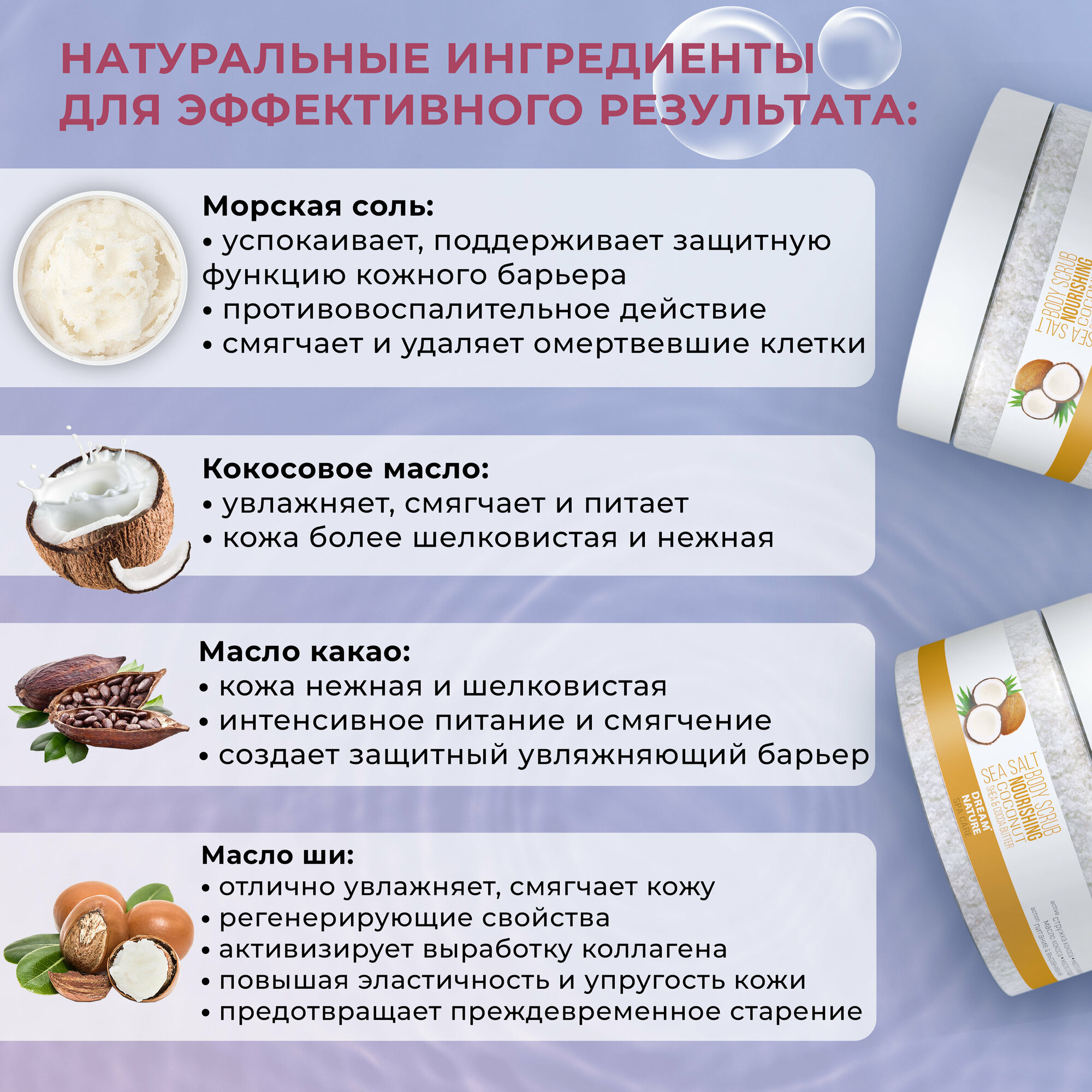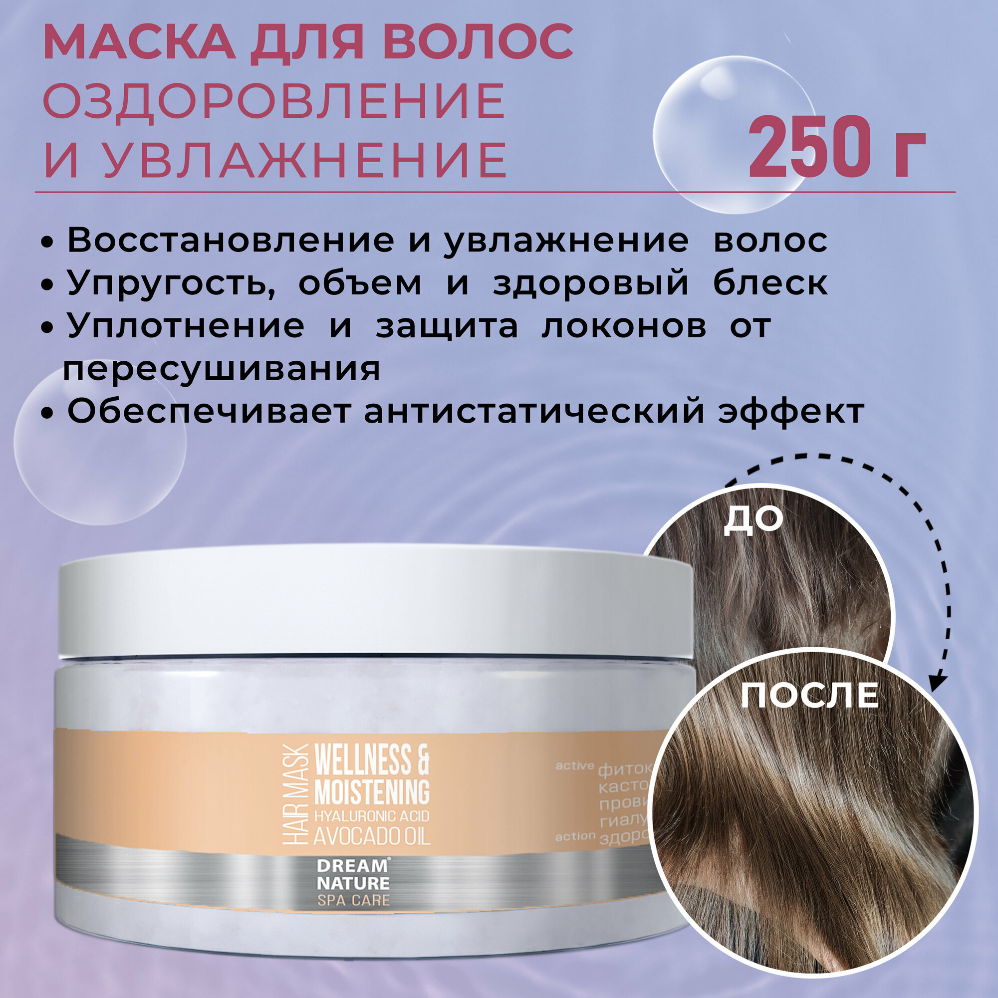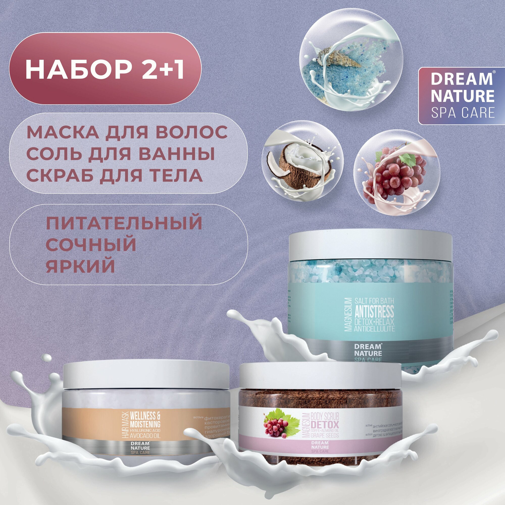 Набор уходовой косметики: Маска для волос Восстановление и увлажнение + Скраб для тела Питательный + Соль для ванны с лавандой Dream Nature SPA&CARE