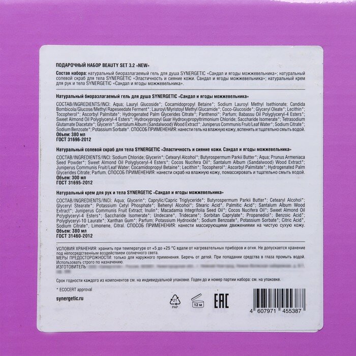 | Состав | Гель для душа SYNERGETIC «Сандал и ягоды можжевельника» Aqua |