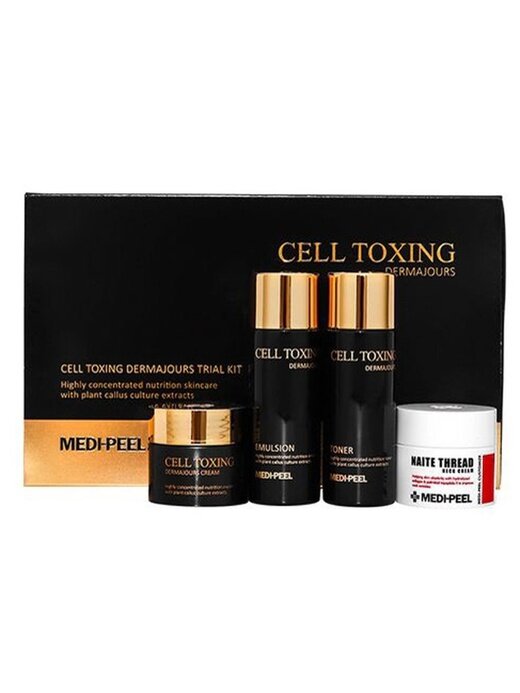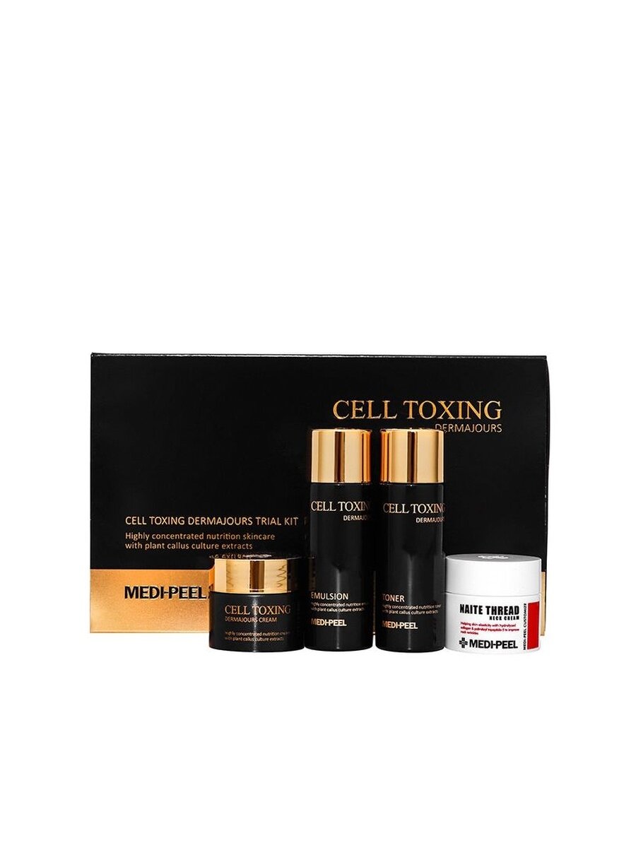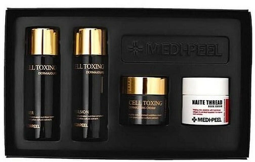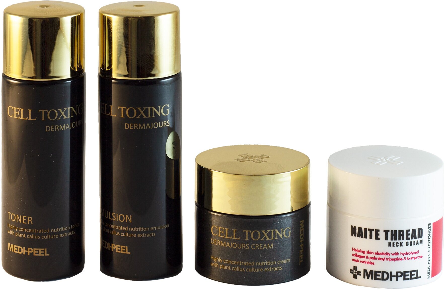 | В наборе | Тонер Medi-Peel Cell Toxing Dermajours Toner — 30 мл Эмульсия Medi-Peel Cell Toxing Dermajours Emulsion — 30 мл Омолаживающий крем Medi-Peel Cell Tox Dermajou Cream — 10 мл Подтягивающий крем для шеи Medi-Peel Naite Thread Neck Cream — 10 мл |