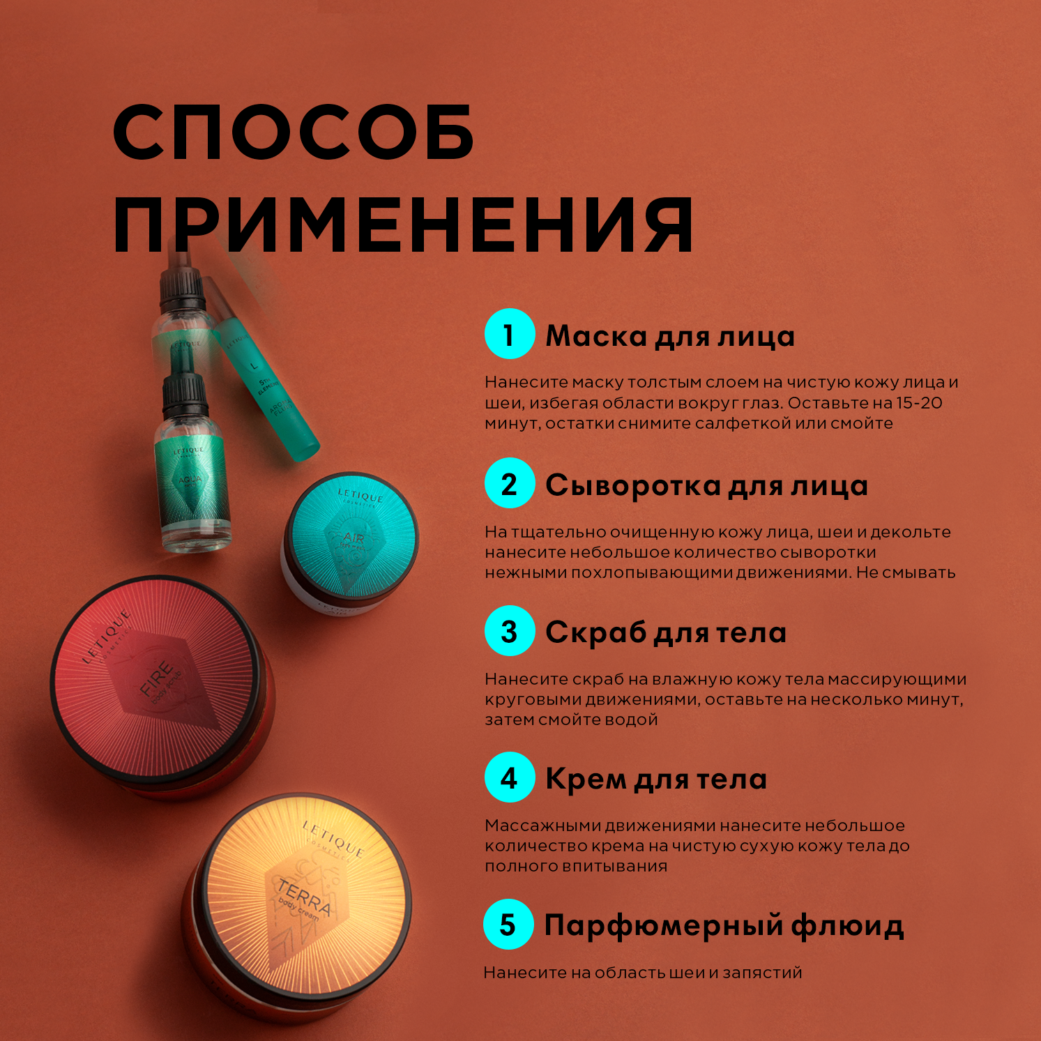 | Способ применения | СЫВОРОТКА ДЛЯ ЛИЦА AQUA FACE SERUM На тщательно очищенную кожу лица, шеи и декольте нанесите небольшое количество сыворотки нежными похлопывающими движениями. Не смывать. МАСКА ДЛЯ ЛИЦА AIR FACE MASK Нанесите маску толстым слоем на чистую кожу лица и шеи, избегая области вокруг глаз. Оставьте на 15-20 минут, остатки снимите салфеткой или смойте. СКРАБ ДЛЯ ТЕЛА FIRE BODY SCRUB Нанесите скраб на влажную кожу тела массирующими круговыми движениями, оставьте на несколько минут, затем смойте водой. КРЕМ ДЛЯ ТЕЛА TERRA BODY CREAM Массажными движениями нанесите небольшое количество крема на чистую сухую кожу тела до полного впитывания. ПАРФЮМЕРНЫЙ ФЛЮИД 5TH ELEMENT AROMA FLUID Нанесите на область шеи и запястий. |