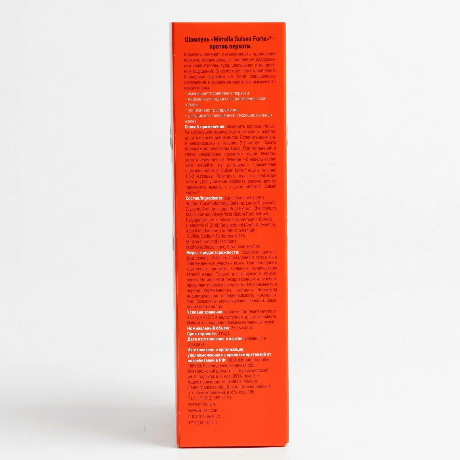 | Способ применения | намочить волосы. Нанести небольшое количество шампуня и распределить по всей длине волос. Вспенить шампунь и массировать в течение 2-3 минут. Смыть большим количеством воды. При попадании в глаза немедленно промойте водой. Использовать через день в течение 4-6 недель, после чего перейти на регулярное применение дерматологически мягкого шампуня «Mirrolla Sulsen Mite» еще в течение 1,5-2 месяцев. Повторять курс по необходимости. Для усиления эффекта рекомендуется применять вместе с пастой «Mirrolla Sulsen Forte» |