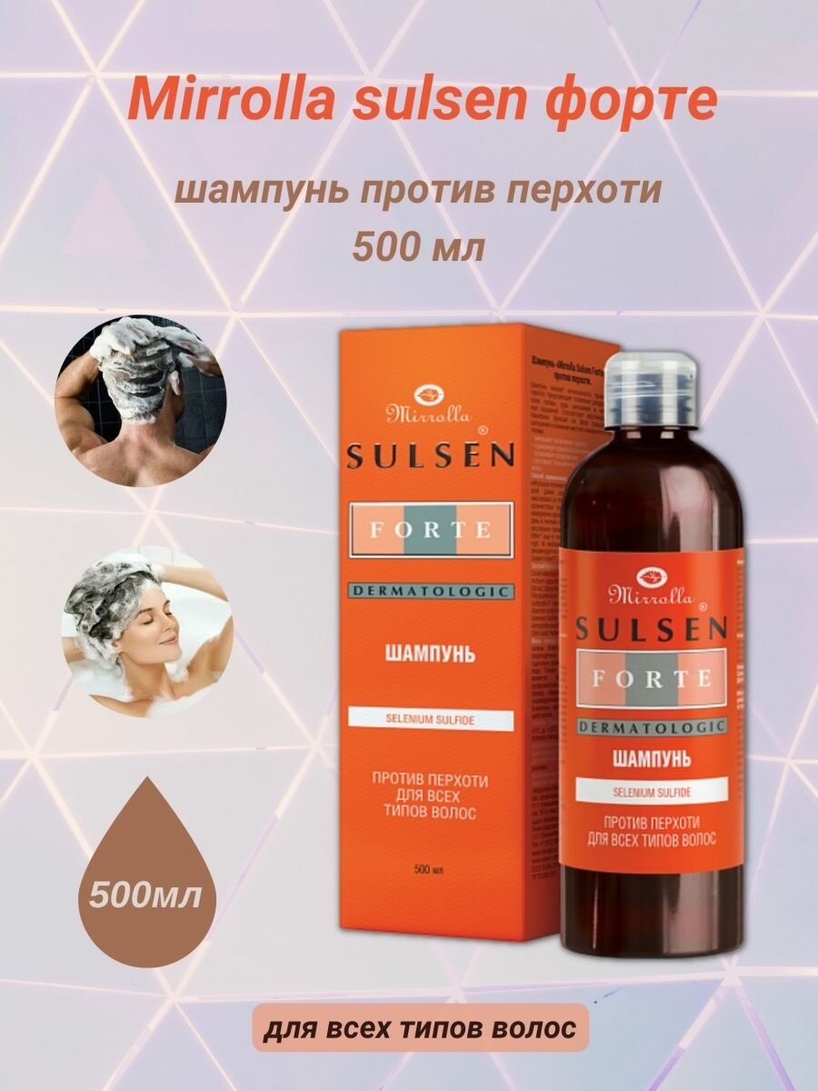 | Способ применения | намочить волосы. Нанести небольшое количество шампуня и распределить по всей длине волос. Вспенить шампунь и массировать в течение 2-3 минут. Смыть большим количеством воды. При попадании в глаза немедленно промойте водой. Использовать через день в течение 4-6 недель, после чего перейти на регулярное применение дерматологически мягкого шампуня «Mirrolla Sulsen Mite» еще в течение 1,5-2 месяцев. Повторять курс по необходимости. Для усиления эффекта рекомендуется применять вместе с пастой «Mirrolla Sulsen Forte» |