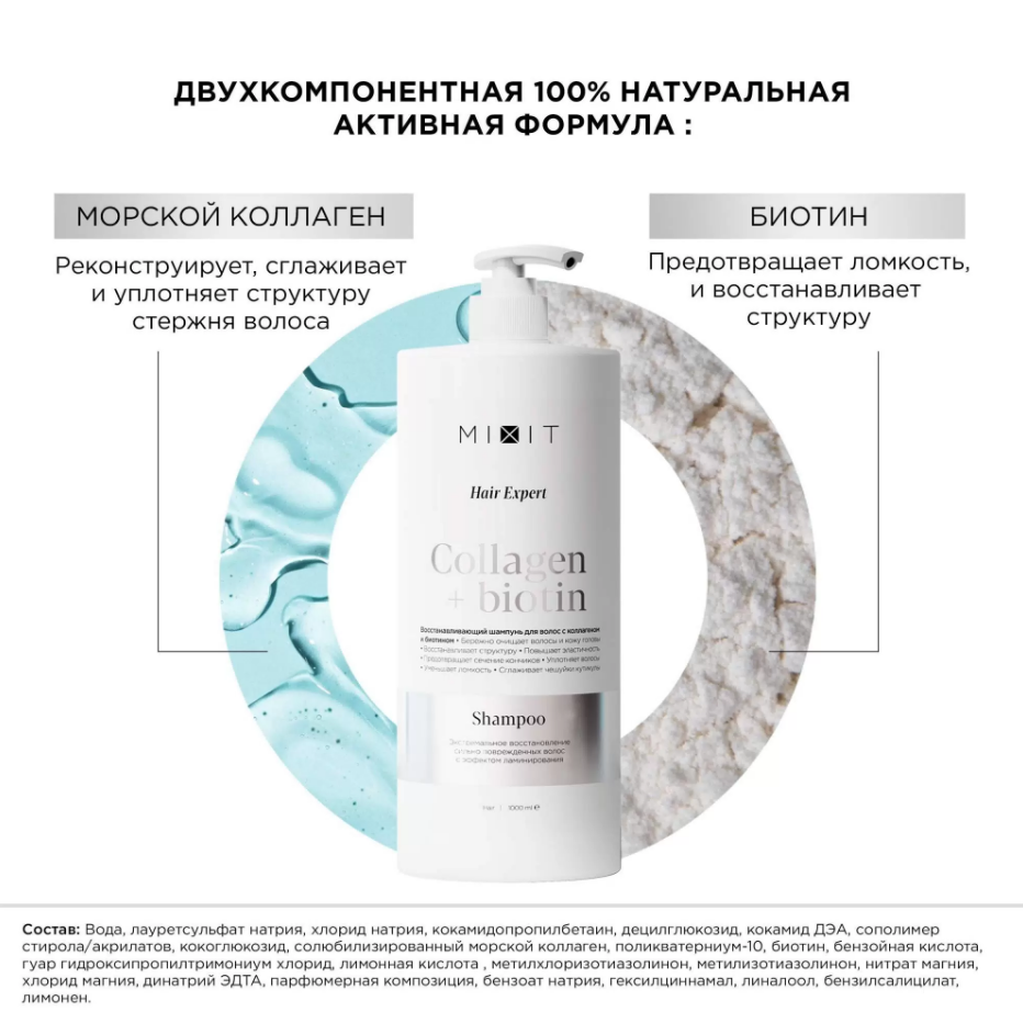 СохранитьШампунь для волос восстанавливающий Mixit Collagen&Biotin, с коллагеном и биотином, 1000 мл интересное: