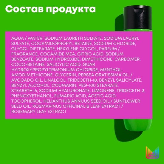 | Состав | aqua / water, sodium laureth sulfate, sodium lauryl sulfate, cocamidopropyl betaine, sodium chloride, glycol distearate, hexylene glycol, parfum / fragrance, cocamide mea, citric acid, sodium benzoate, sodium hydroxide, dimethicone, carbomer, coco-betaine, salicylic acid, guar hydroxypropyltrimonium chloride, menthol, amodimethicone, glycerin, persea gratissima oil / avocado oil, linalool, trideceth-10, benzyl salicylate, benzyl alcohol, coumarin, peg-100 stearate, steareth-6, sodium hyaluronate, limonene, trideceth-3, phenoxyethanol, fumaric acid, acetic acid, tocopherol, helianthus annuus seed oil / sunflower seed oil, rosmarinus officinalis leaf extract / rosemary leaf extract |
