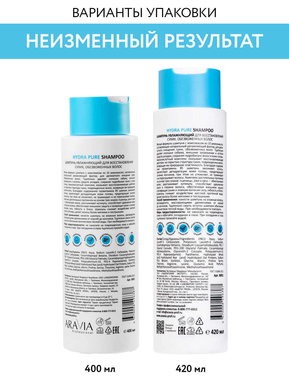 ARAVIA Шампунь увлажняющий для восстановления сухих, обезвоженных волос Hydra Pure Shampoo, 420 мл