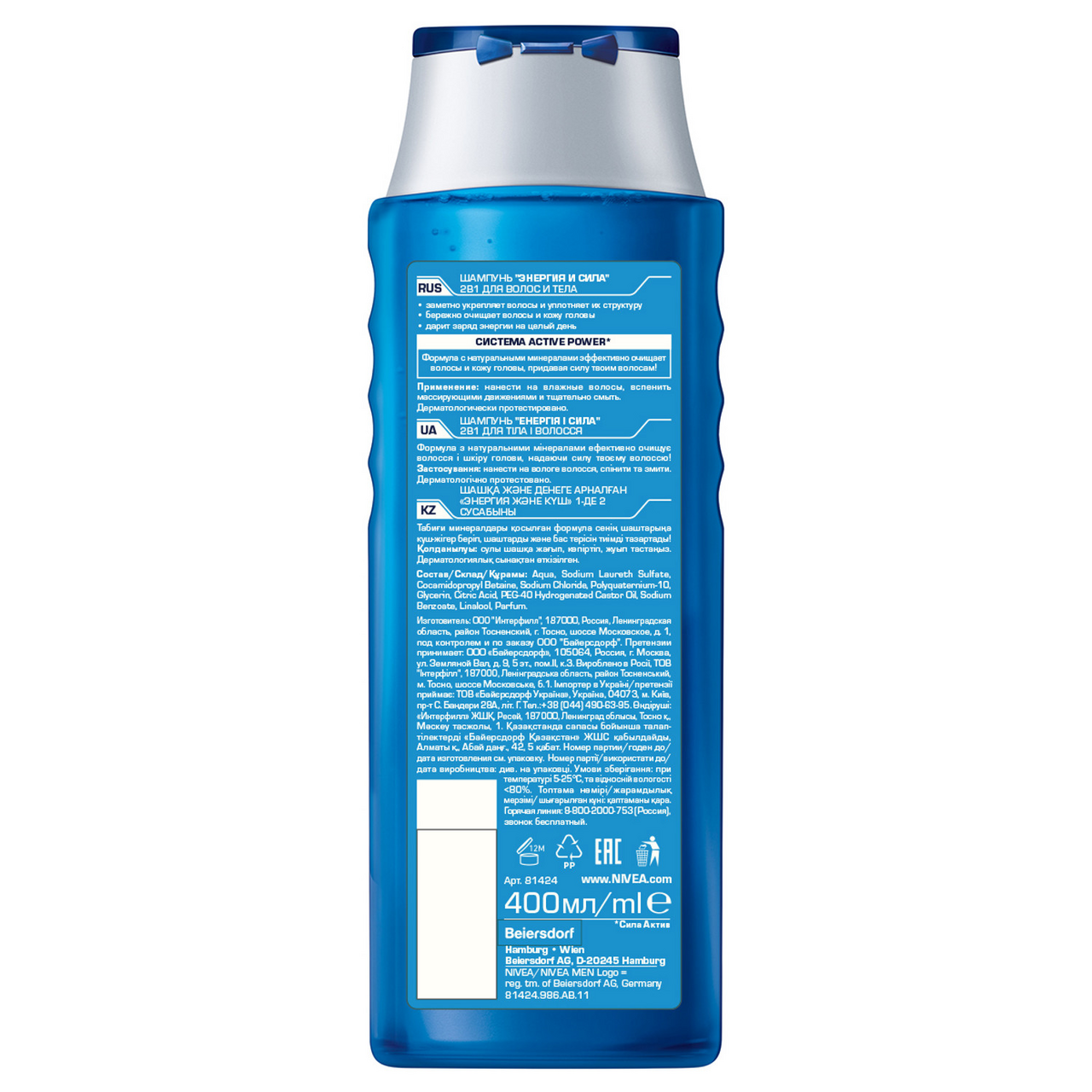 Nivea Men Энергия И Сила Шампунь 2 в 1 для волос и тела 400 мл.