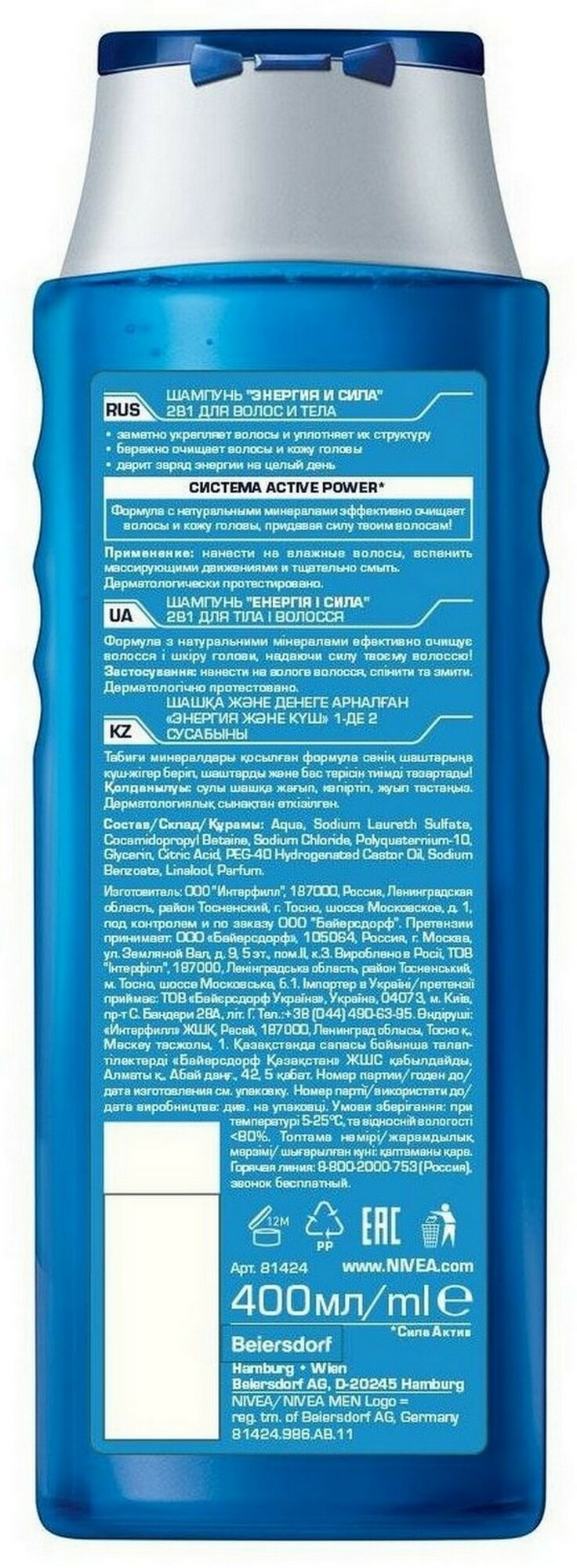 Nivea Men Энергия И Сила Шампунь 2 в 1 для волос и тела 400 мл.