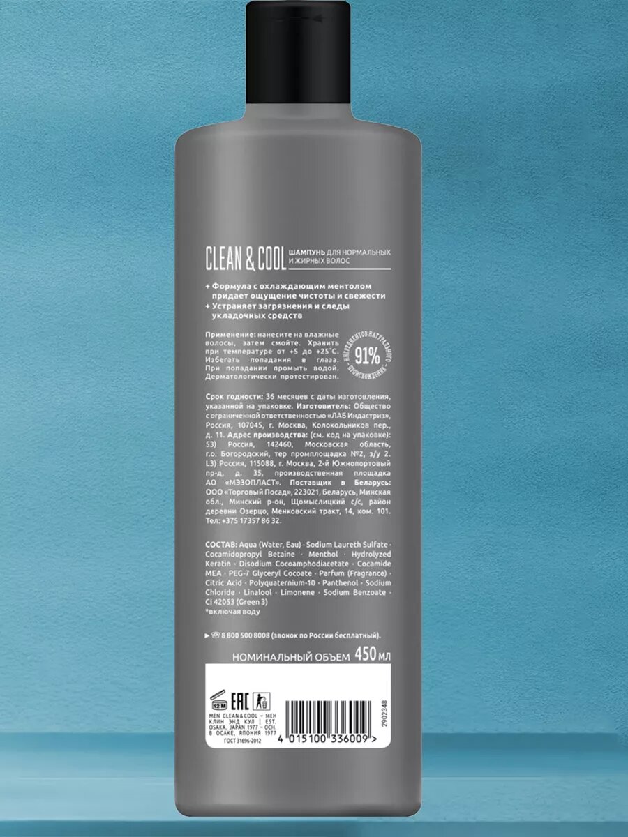 Шампунь для волос СЬĔСС Men "Clean&Cool" мужской, для нормальных и жирных, глубокое очищение, ментол для придания свежести, 450 мл.