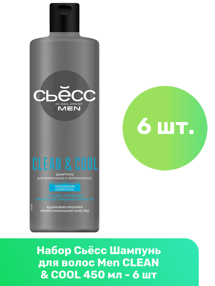 Сьесс Шампунь мужской Clean & Cool для нормальных и жирных волос, глубокое очищение, для жирной кожи головы, 450 мл