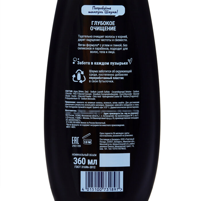 Шампунь для волос Шаума Men Глубокое Очищение 3в1 Уголь + Белая Глина 360 мл
