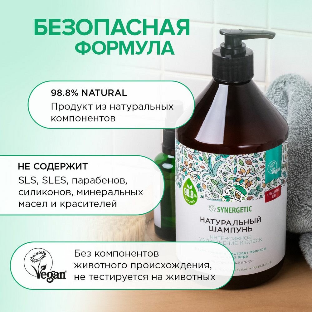 Натуральный бессульфатный шампунь SYNERGETIC Интенсивное увлажнение и блеск 400 мл