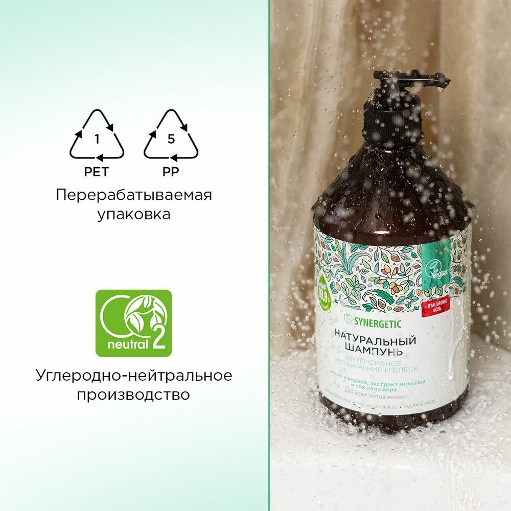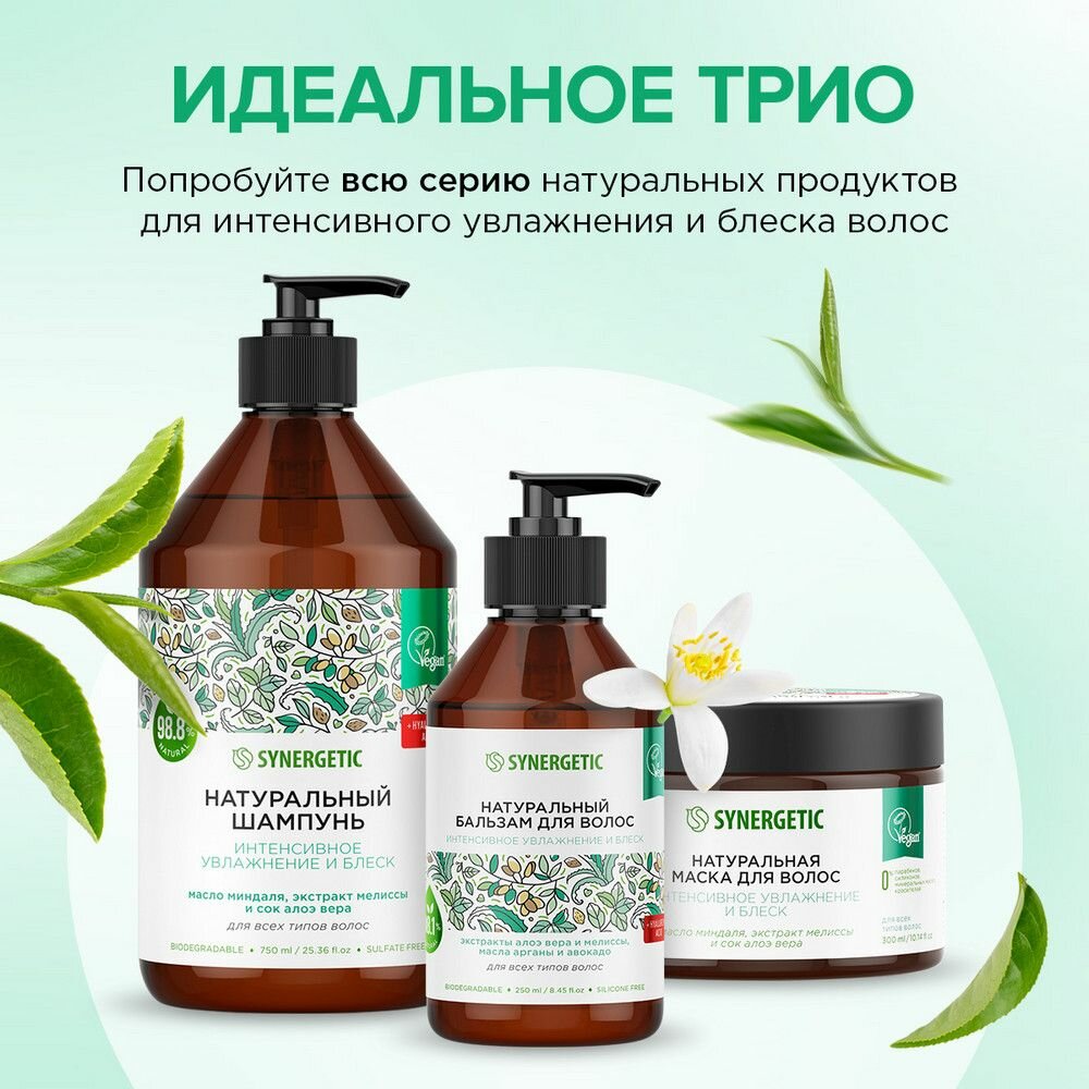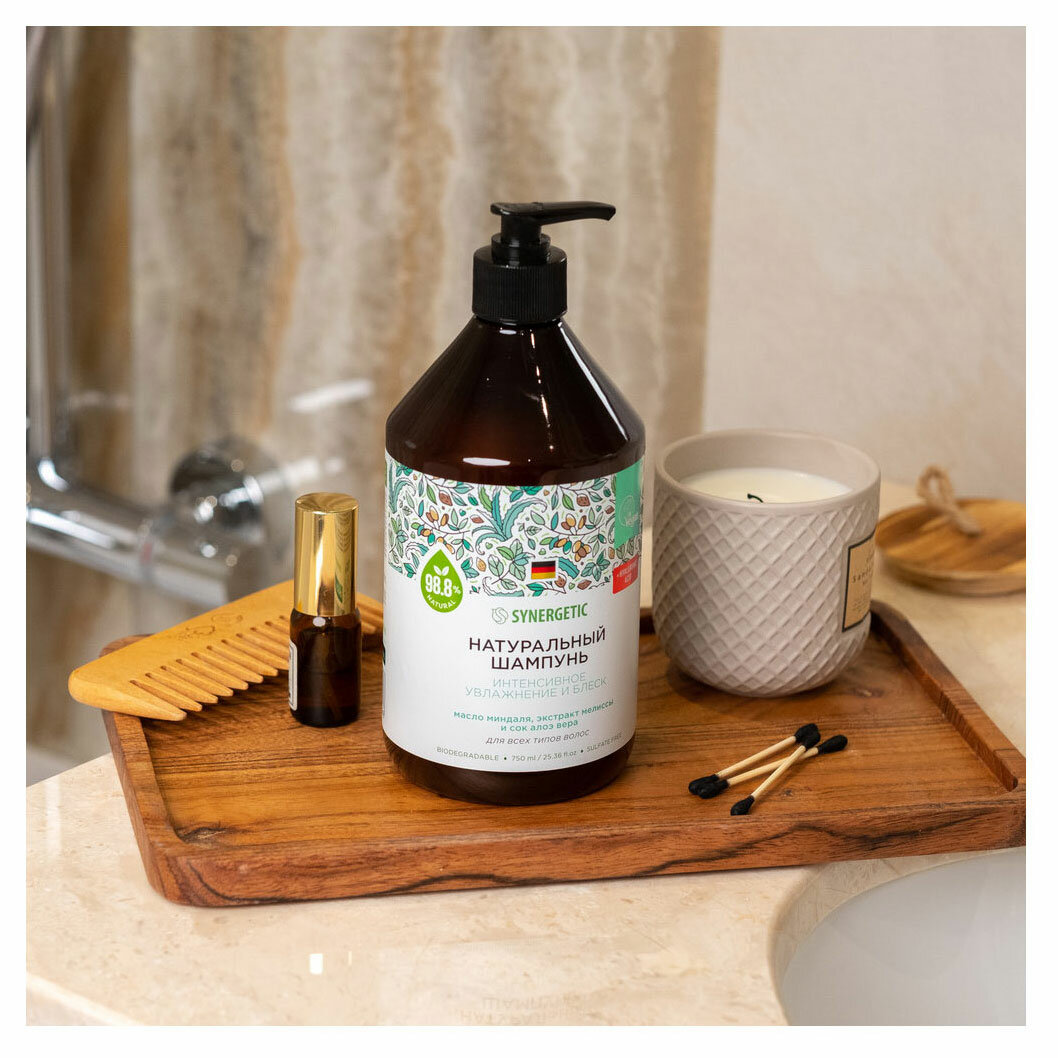 Шампунь для всех типов волос SYNERGETIC "Интенсивное увлажнение и блеск" натуральный, бессульфатный, 750мл