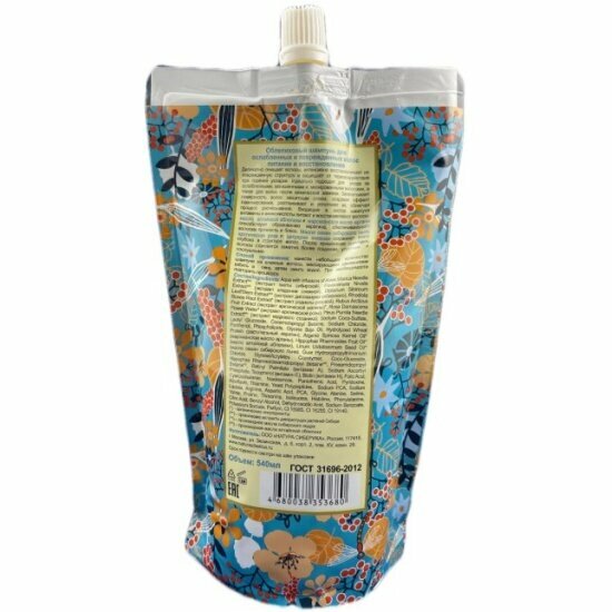 | Состав | aqua with infusions of: abies sibirica needle extract (экстракт пихты сибирской), cetraria nivalis extract (экстракт кладонии снежной), argania spinosa kernel oil (марроканское масло арганы), linum usitatissimum (linseed) seed oil (масло семян сибирского льна), diplazim sibiricum extract (экстракт диплазиума сибирского), pinus pumila needle extract (экстракт кедрового стланника), rosa damascena flower extract (экстракт арктической розы), rubus idaeus seed extract (экстракт арктической малины), hippophae rhamnoides fruit oil (масло алтайской облепихи), sodium coco-sulfate, cocamidopropyl betaine, lauryl gluciside, panthenol, coco-glucoside, glyceryl oleate, hydrolyzed wheat protein, guar hydroxypropyltrimonium chloride, retinyl palmitate (витамин а), tocopherol (витамин e), biotin (витамин н), hippophae rhamnoidesamidopropyl betaine, benzyl alcohol, sodium chloride, benzoic acid, sorbic acid, citric acid, parfum |