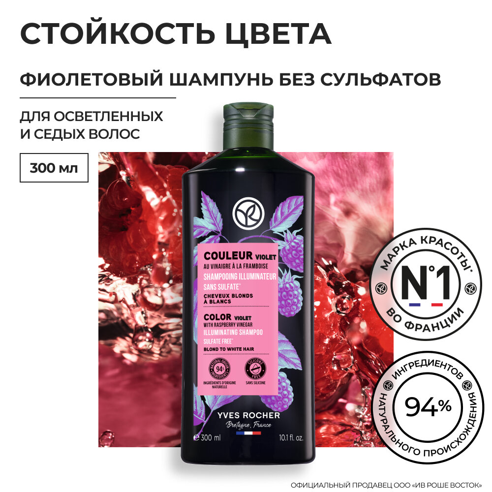 Купить Yves Rocher Фиолетовый Шампунь стойкость цвета с Малиновым Уксусом - Без Сульфатов - Для осветленных и седых волос, 300мл