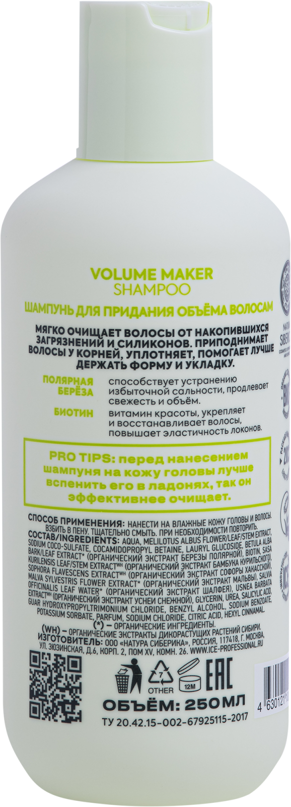 NATURA SIBERICA, ICE PROFESSIONAL, Volume Maker, Шампунь для придания объёма волосам, 250 мл интересное:
