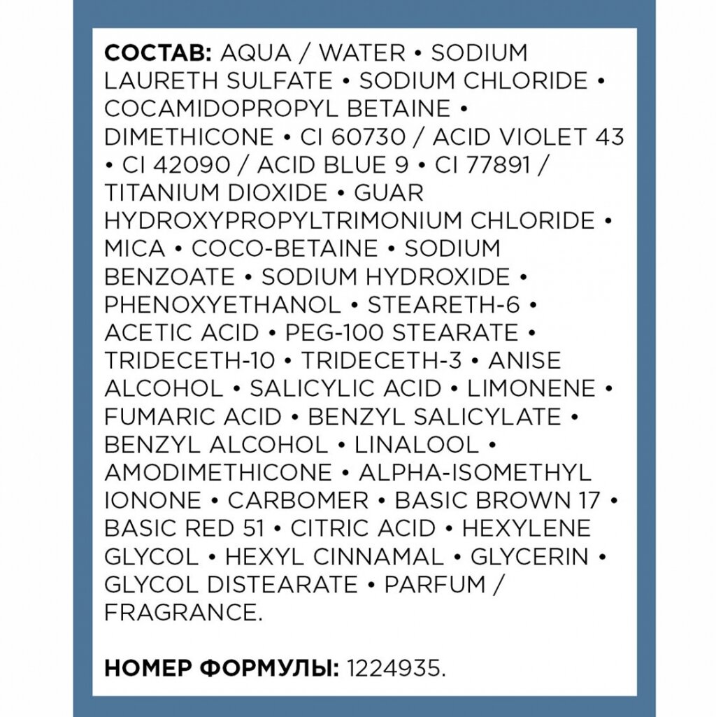 | Состав | AQUA / WATER, SODIUM LAURETH SULFATE, SODIUM CHLORIDE, COCAMIDOPROPYL BETAINE, DIMETHICONE, CI 60730 / ACID VIOLET 43, CI 61570 / ACID GREEN 25, CI 42090 / ACID BLUE 9, CI 47005 / ACID YELLOW 3, CI 77891 / TITANIUM DIOXIDE, GUAR HYDROXYPROPYLTRIMONIUM CHLORIDE, MICA, COCO-BETAINE, SODIUM BENZOATE, SODIUM HYDROXIDE, PHENOXYETHANOL, STEARETH-6, ACETIC ACID, PEG-100 STEARATE, TRIDECETH-10, TRIDECETH-3, ANISE ALCOHOL, SALICYLIC ACID, LIMONENE, FUMARIC ACID, BENZYL SALICYLATE, BENZYL ALCOHOL, LINALOOL, AMODIMETHICONE, ALPHA-ISOMETHYL IONONE, CARBOMER, CITRIC ACID, HEXYLENE GLYCOL, HEXYL CINNAMAL, GLYCERIN, GLYCOL DISTEARATE, PARFUM / FRAGRANCE. |