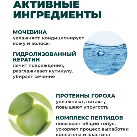 | Активный ингредиент | аллантоин / аминокислоты / бетаин / витамин E / гиалуроновая кислота / гидролизованный шелк / глицерин / керамиды / кератин / коллаген / лимонная кислота / молочная кислота / мочевина / полисахариды / протеины / протеины пшеницы / протеины шелка / салициловая кислота / хитозан / яблочный уксус |