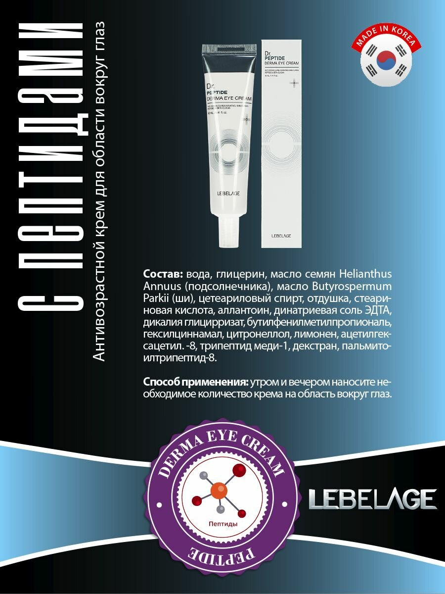 LEBELAGE Антивозрастной крем для области вокруг глаз, для ухода за кожей век с пептидами, корейская косметика. 40мл интересное: