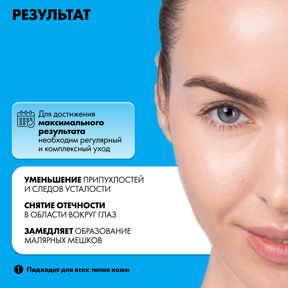 | Способ применения | Нанести на чистую кожу минимальное количество крем-геля в направлении под бровь от внутреннего уголка глаза к внешнему и под глазом в направлении от внешнего уголка глаза к внутреннему. Избегать подвижное веко и не подходить близко к ресничному краю. Использовать утром и вечером не менее, чем за 1,5 часа до сна |