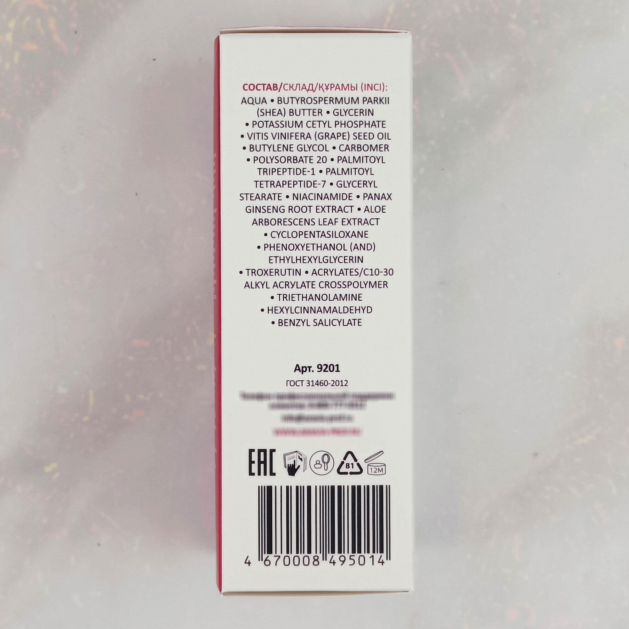 | Состав | Аqua, Butyrospermum Parkii (Shea) Butter, Glycerin, Potassium Cetyl Phosphate, Vitis Vinifera (Grape) Seed Oil, Butylene Glycol, Carbomer, Polysorbate 20, Palmitoyl Tripeptide-1, Palmitoyl Tetrapeptide-7, Glyceryl Stearate, Niacinamide, Panax Ginseng Root Extract, Aloe Arborescens Leaf Extract, Cyclopentasiloxane, Phenoxyethanol (and) Ethylhexylglycerin, Troxerutin, Acrylates/ C10-30 Alkyl Acrуlate Crosspolymer, Triethanolamine, Hexylcinnamaldehyd, Benzyl Salicylate. |