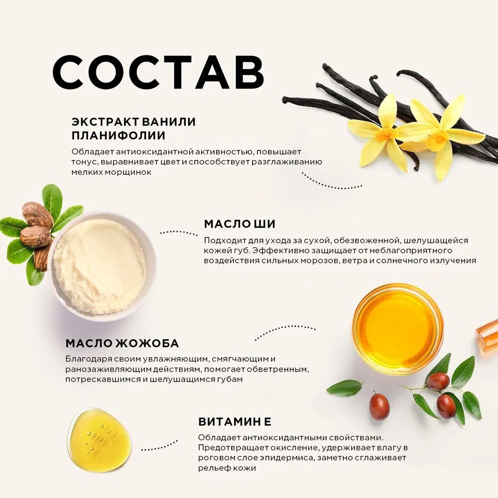 | Состав | Petroleum Jelly, Bis-Diglyceryl Polyacyladipate-2, Caprylic/Capric Triglyceride, Ethylhexyl Methoxycinnamate, Microcrystalline Wax (Cera Microcristallina), Beeswax, Theobroma Cacao (Cocoa) Seed Butter, Butyrospermum Parkii (Shea) Butter, PPG-3 Hydrogenated Castor Oil, Simmondsia Chinensis (Jojoba) Seed Oil, Isononyl Isononanoate, Cetearyl Behenate, Stearic Acid, Paraffin, Polyethylene, Tocopherol, Caprylyl Glycol, Phenoxyethanol, Flavor, Vanilla Planifolia (Vanilla) Fruit Extract, Pentaerythrityl Tetra-Di-T-Butyl Hydroxyhydrocinnamate, Sodium Saccharin, Isopropyl Titanium Triisostearate, may contain (+/-) Yellow 6 Lake, Yellow 5 Lake. |
