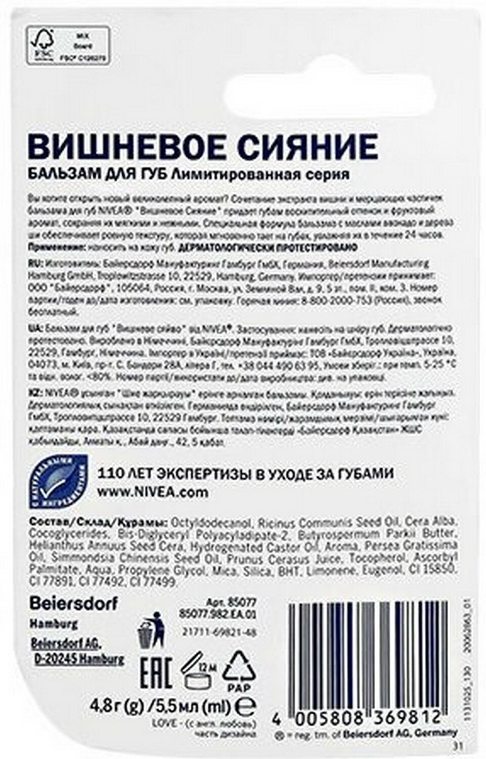 СохранитьNivea Бальзам для губ Вишневое сияние, 4,8 г, 6 шт / интересное:
