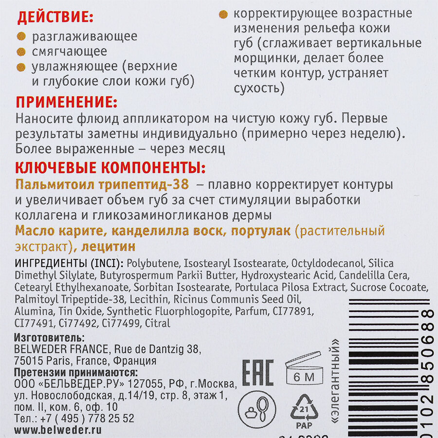 | Способ применения | наносите флюид аппликатором на чистую кожу губ. Первые результаты заметны через 7 дней. Для получения устойчивого результата наносите флюид минимум 3 раза в день (утро-день-вечер) |