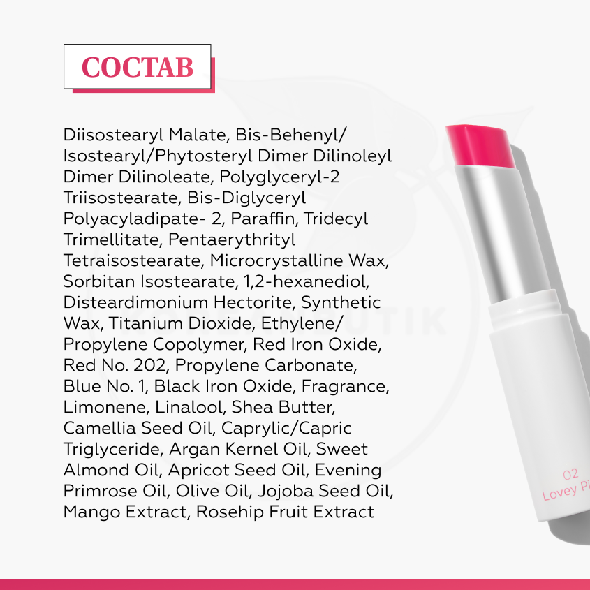 | Состав | Diisostearyl Maleate, Bis-Behenyl/Isostearyl/Phytosteryl Dimer Dilinoleyl Dimer Dilinoleate, Polyglyceryl-2 Triisostearate, Bis-Diglyceryl Polyacyl Adipate- 2, paraffin, tridecyl trimellitate, pentaerythrityl tetraisostearate, microcrystalline wax, sorbitan isostearate, 1,2-hexanediol, disteadymonium hectorite, synthetic wax, titanium Dioxide, Ethylene/Propylene Copolymer, Red Iron Oxide, Red No. 202, Propylene Carbonate, Blue No. 1, Black Iron Oxide, Fragrance, Limonene, Linalool, Shea Butter, Camellia Seed Oil, Caprylic/Capric Triglyceride, Argan Kernel Oil, Sweet Almond Oil, Apricot Seed Oil, Evening Primrose Oil, Olive Oil, Jojoba Seed Oil, Mango Extract, Rosehip Fruit Extract |