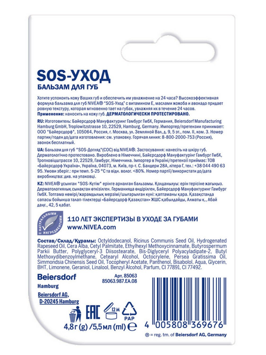 Nivea Бальзам для губ SOS-Уход, 4.8 г