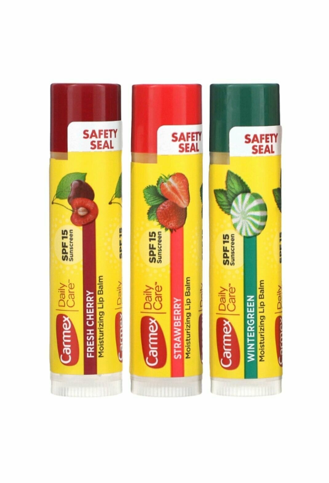 Carmex Набор бальзам для губ ассорти, вишня, клубника, мятный леденец, в стике SPF 15, 4,25 г., 3 шт.