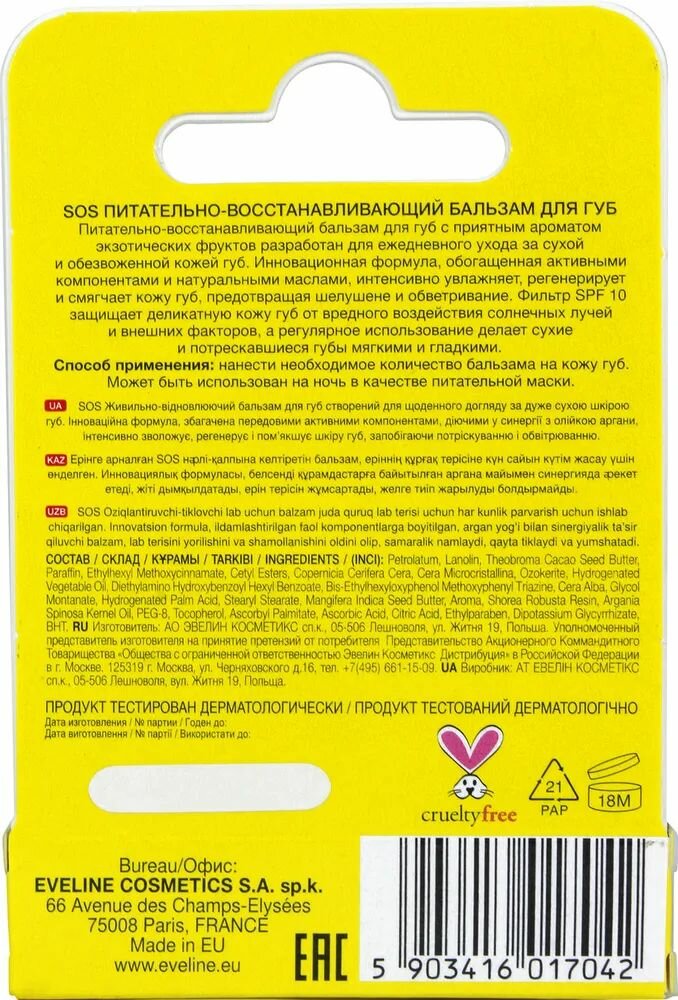 Бальзам для губ EVELINE SOS ARGAN OIL EXOTIC MANGO восстанавливающий 4,5 г