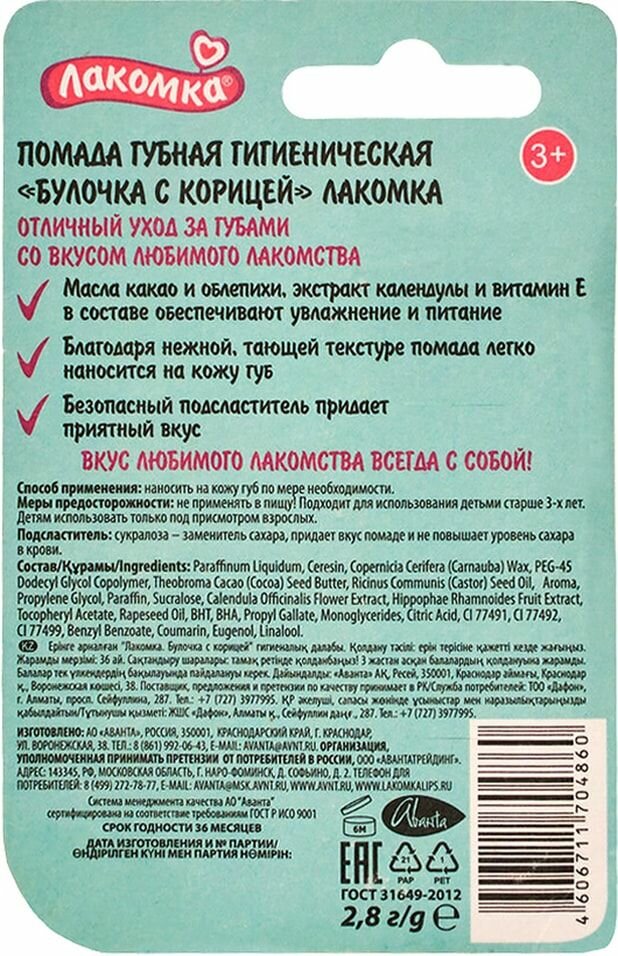 Помада гигиеническая булочка с корицей Лакомка 2,8г
