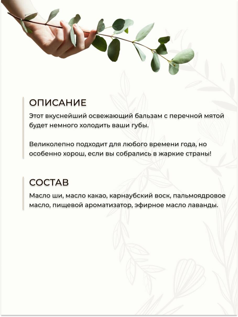 | Способ применения | необходимое количество бальзама нанести на губы. Повторять в течение дня по мере необходимости |