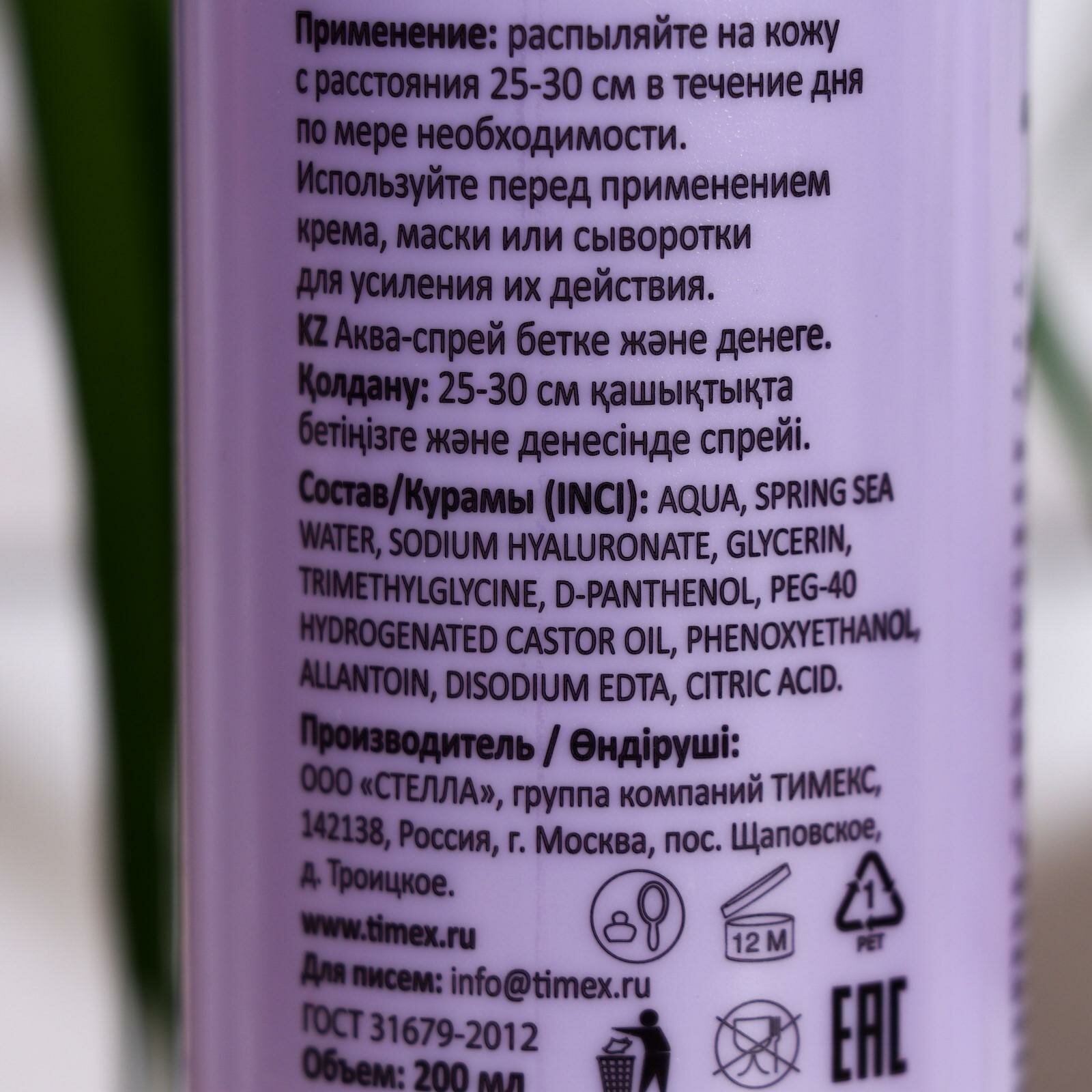 | Дополнительная информация | Аква-спрей содержит чистую гиалуроновую кислоту, благодаря которой «утоляет жажду» кожи и удерживает влагу в ее верхних слоях, не давая испаряться. Способствует восстановлению поврежденных тканей. Незаменим для ухода за кожей в жаркое время года. Особенно рекомендуется для зрелой, сухой и обезвоженной кожи. * средство содержит 99% воды на основе морского источника Spring Sea Water, расположенного на глубине 22 метра в экологически чистой зоне близ полуострова Бретань, Франция. Проходя через гранитный разлом, она обогащается минералами – кремнием и марганцем, которые благотворно влияют на кожу. • Наполняет кожу живительной влагой • Предотвращает ее обезвоживание • Защищает от негативных факторов • Препятствует старению кожи |
