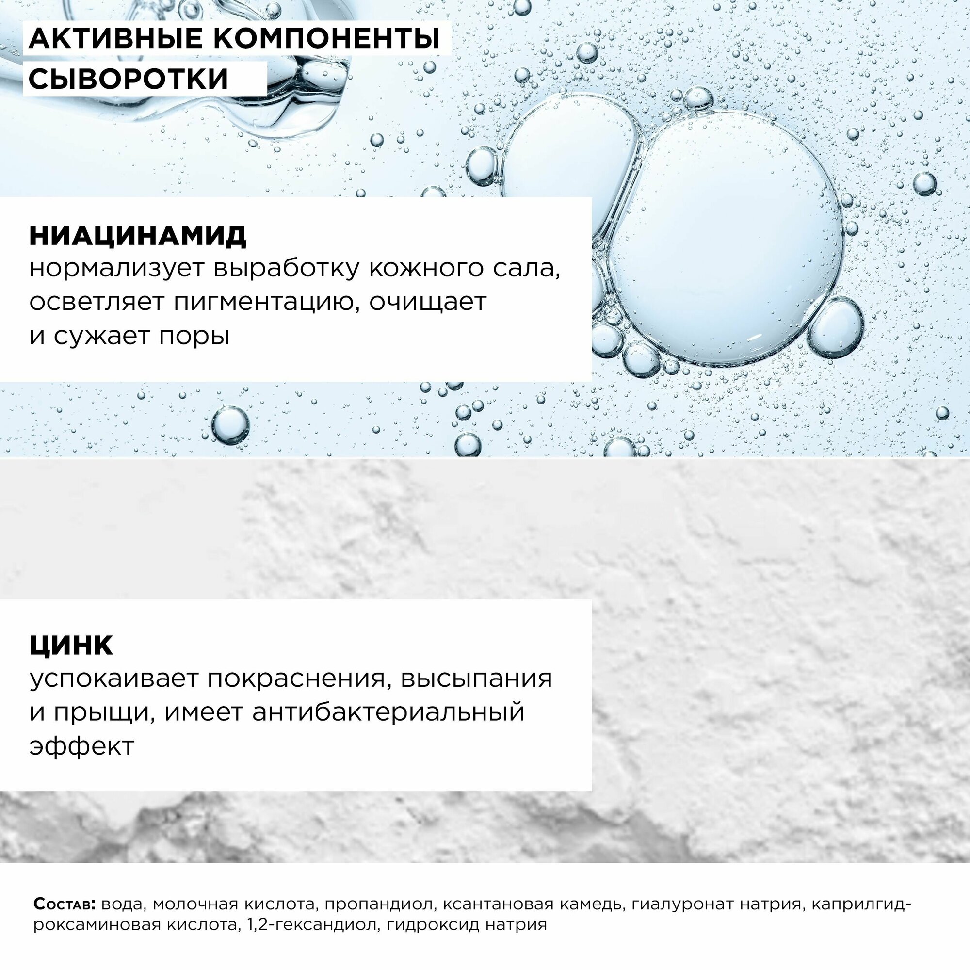 | Активный ингредиент | AHA-кислоты / азелаиновая кислота / аллантоин / бамбуковый уголь / витамин B3 (ниацинамид) / глицерин / цинк |