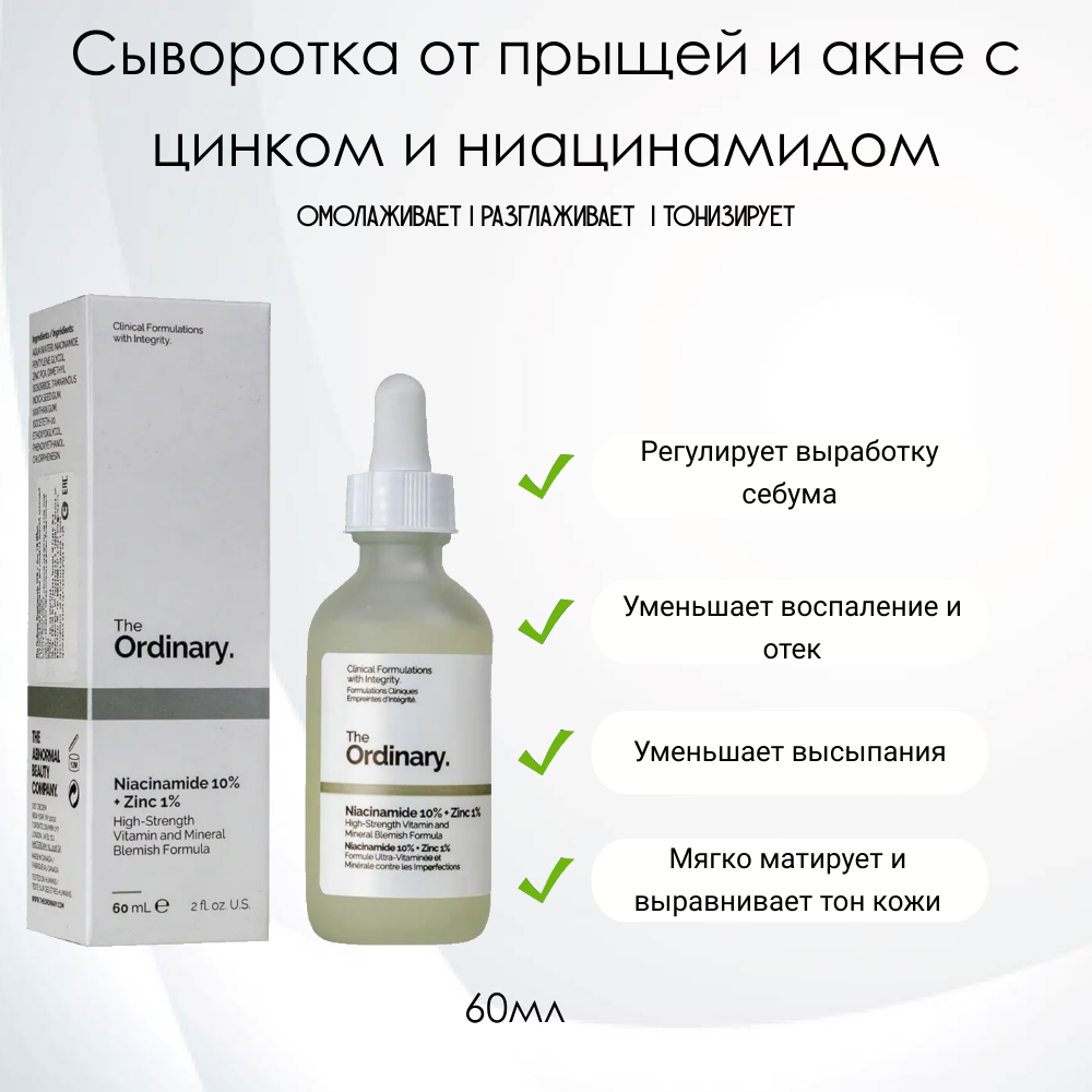 Сыворотка для лица от прыщей и акне Niacinamide 10% + Zinc 1% The Ordinary, объем 60 мл, с ниацинамидом и цинком