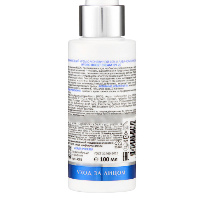 ARAVIA Крем увлажняющий с мочевиной 10% и аква-комплексом HYDRO BOOST CREAM SPF 20, 100 мл