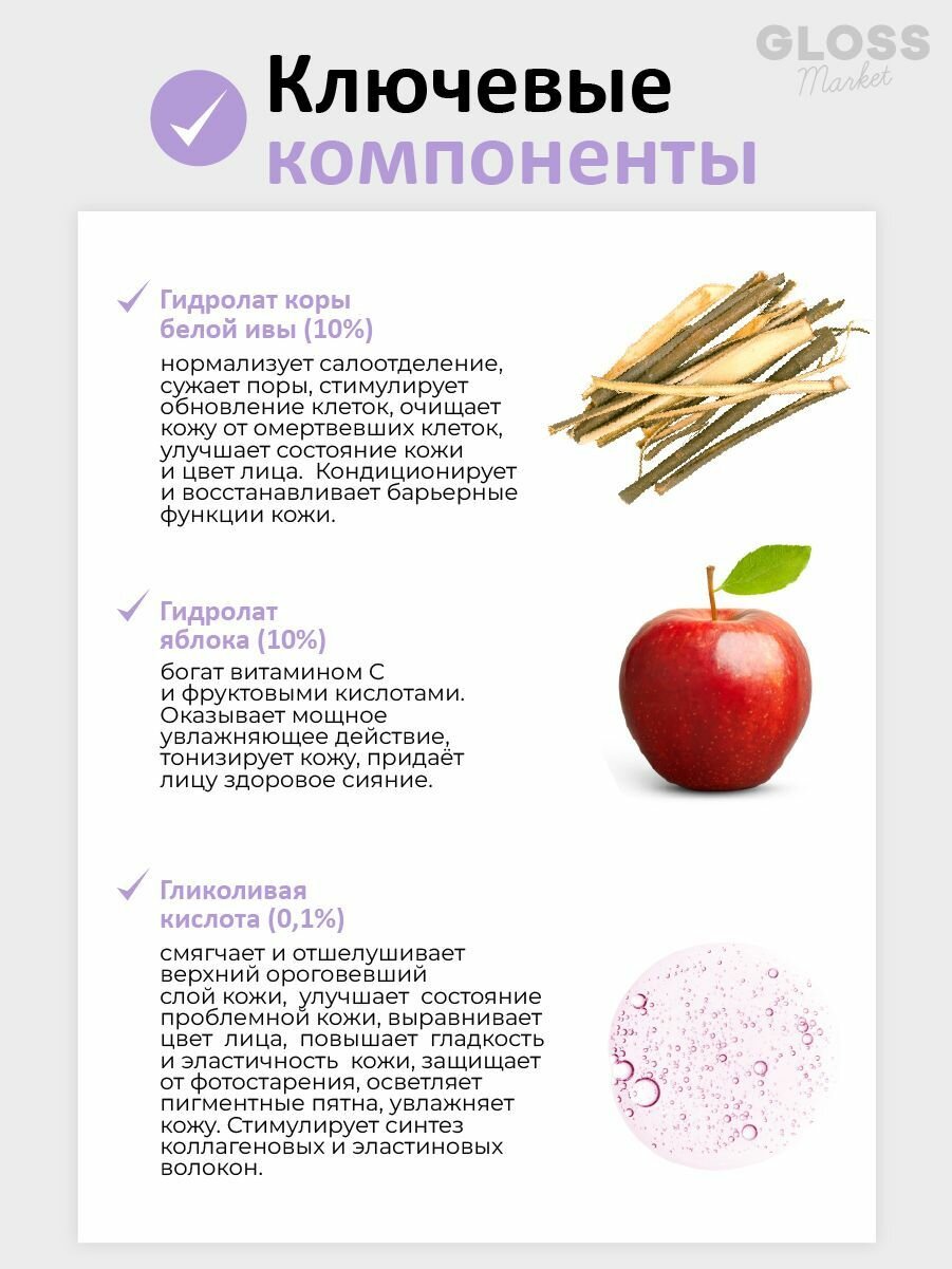 | Состав | water, salix alba (willow) bark water, pyrus malus (apple) fruit water, butylene glycol, 1,2-hexanediol, sodium lactate, glycolic acid, betaine salicylate, allantoin, panthenol, ethyl hexanediol |