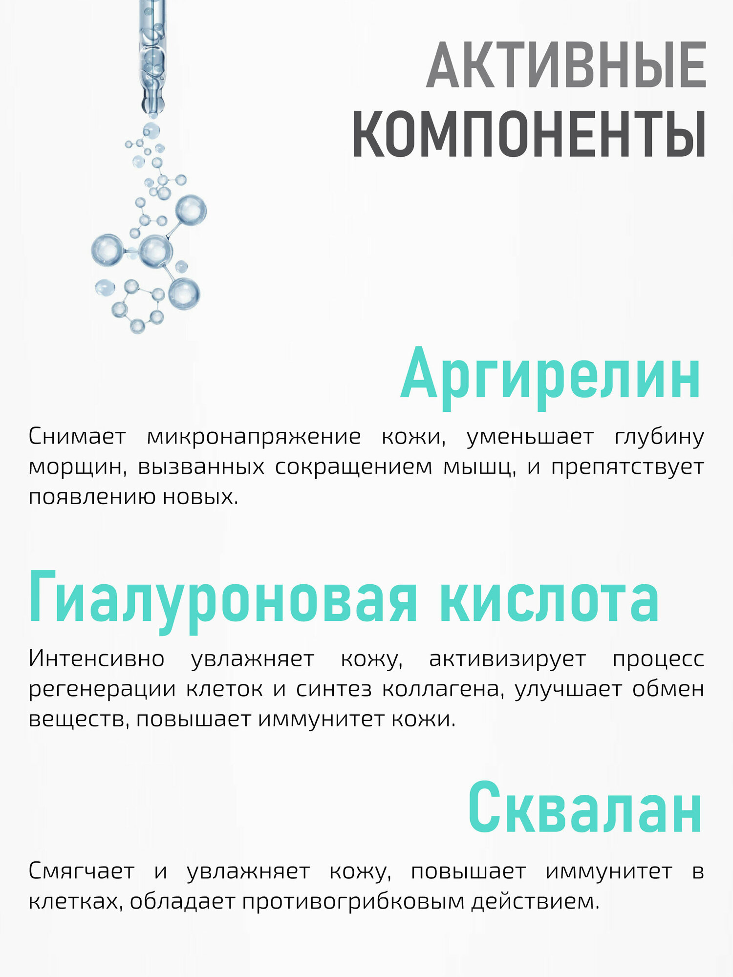 | Состав | Aqua, Argireline (Acetyl Hexapeptide-8), Sodium Hyaluronate, Pentylene Glycol, Dimethyl Isosorbide, Gluconolactone, Squalane. |