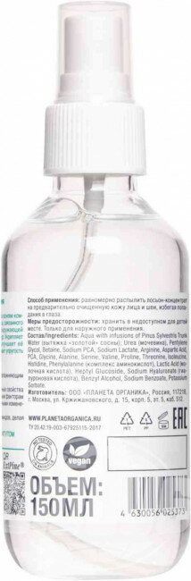 | Состав | Aqua with infusions of Pinus Sylvestris Trunk Water (вытяжка «золотой» сосны); Urea (мочевина), Pentylene Glycol, Betaine, Sodium РСА, Sodium Lactate, Arginine, Aspartic Acid, РСА, Glycine, Alanine, Serine, Valine, Proline, Threonine, lsoleucine, His1idine, Phenylalanine (комплекс аминокислот), Lac1ic Acid (молочная кислота), Heptyl Glucoside, Sodium Hyaluronate (гиалуроновая кислота), Benzyl Alcohol, Sodium Benzoate, Potassium Sorbate. |