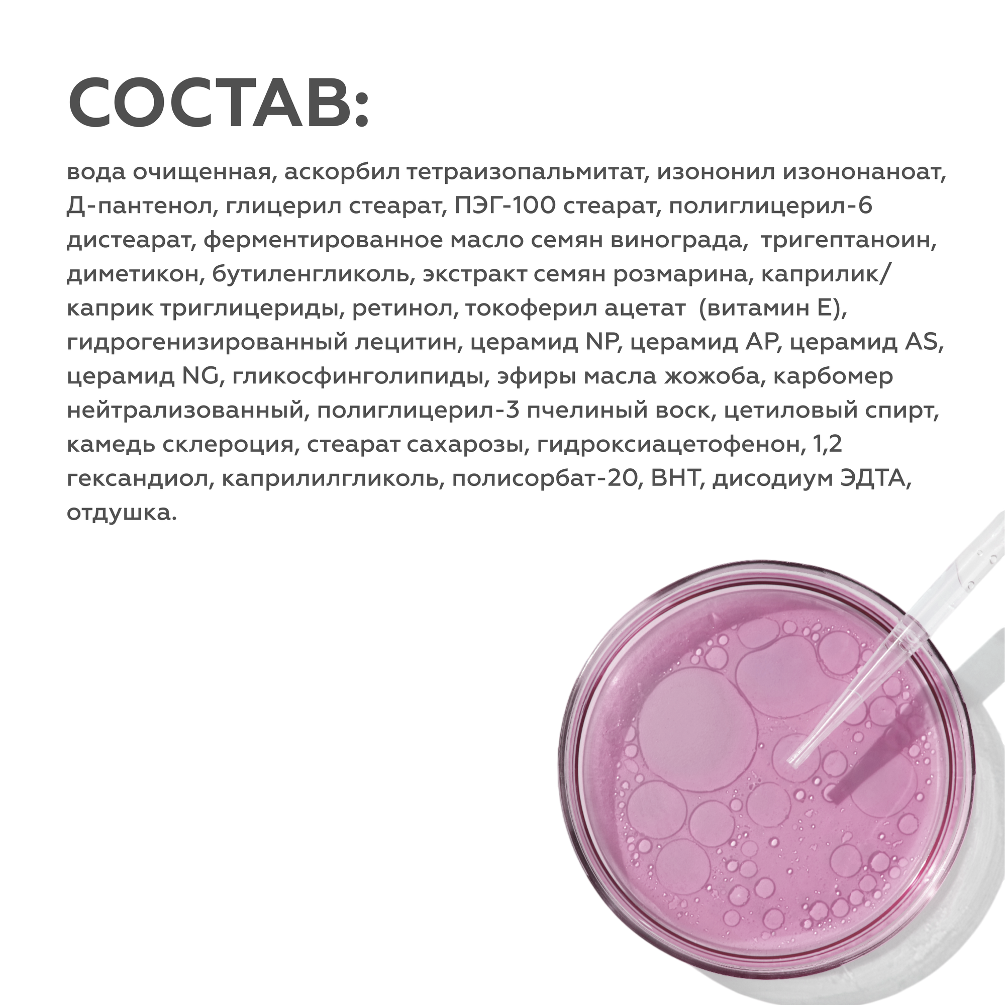 | Состав | вода очищенная, аскорбил тетраизопальмитат, изононил изононаноат, Д-пантенол, глицерил стеарат, ПЭГ-100 стеарат, тригептаноин, ферментированное масло семян винограда, диметикон, бутиленгликоль, ретинол, токоферил ацетат (витамин Е), экстракт семян розмарина, церамид NP, церамид AP, церамид EOP, фитосфингозин, гликосфинголипиды, тетраацетилфитосфингозин, гидрогенизированный лецитин, холестерол, глицерин, стеариновая кислота, ксантановая камедь, гидрогенизированный полидецен, цетеариловый спирт, полиглицерил-6 дистеарат, эфиры масла жожоба, карбомер нейтрализованный, полиглицерил-3 пчелиный воск, цетиловый спирт, камедь склероция, гидроксиацетофенон, 1,2 гександиол, каприлилгликоль, полисорбат-20, БХТ, дисодиум ЭДТА, отдушка |