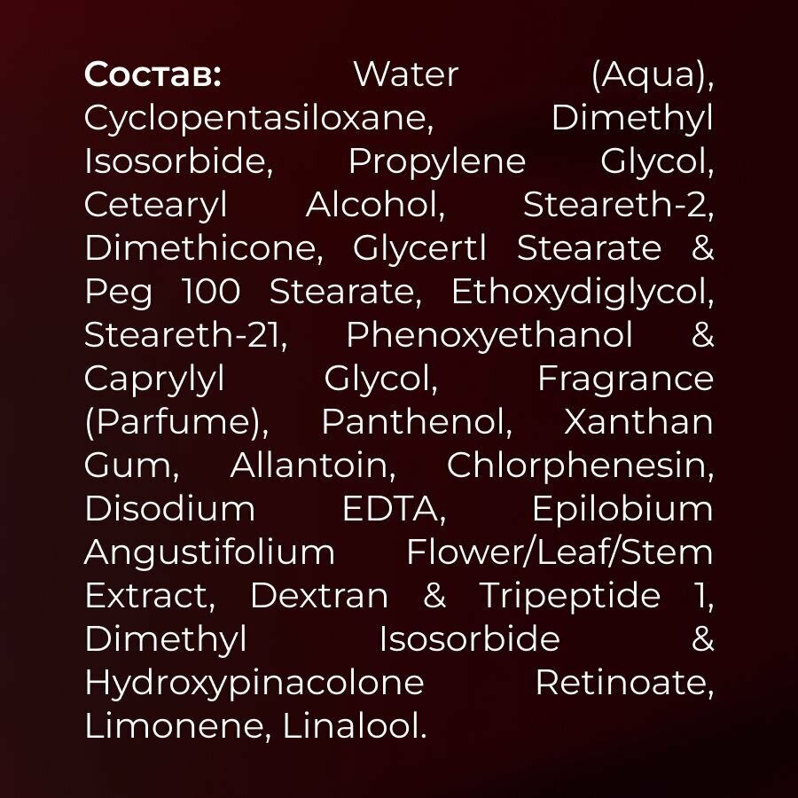 | Состав | RET complex, витамин В5, экстракт семян кипрея, пантенол, пропилен гликоль . |