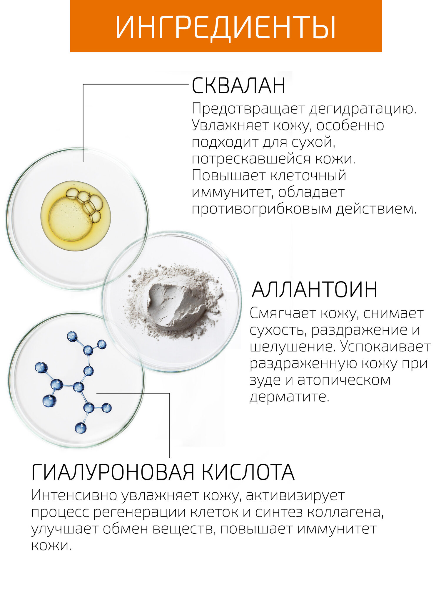 | Активный ингредиент | аллантоин / витамин C (аскорбиновая кислота) / витамины / гиалуроновая кислота / сквалан |