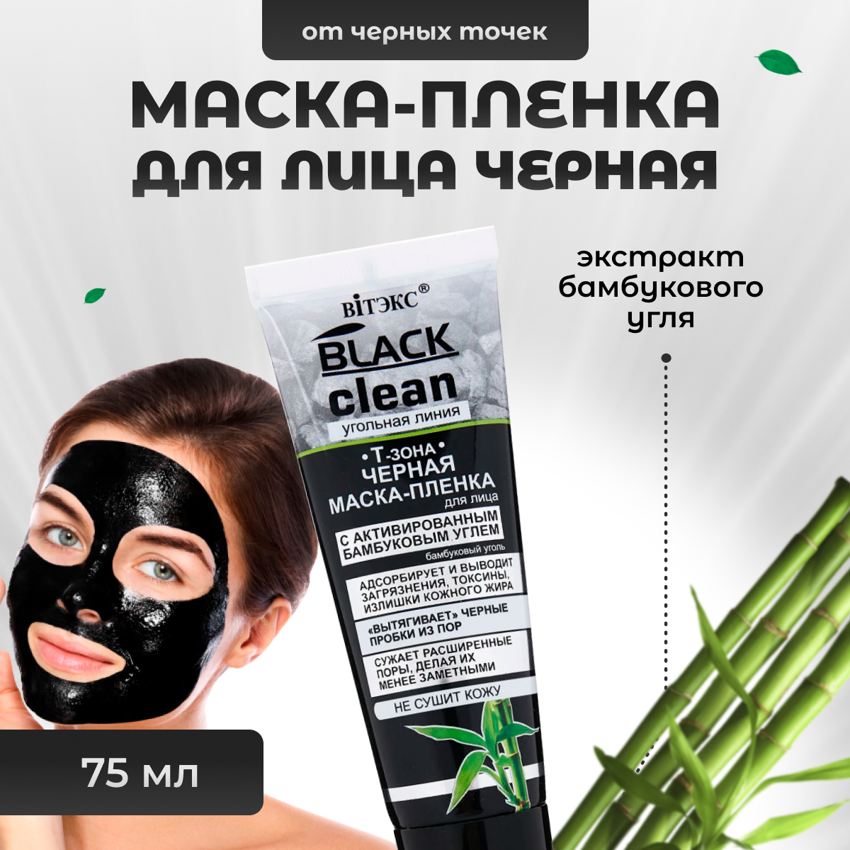 Черная маска-пленка для лица с активированным бамбуковым углем, Black Clean, 75 мл, Витэкс