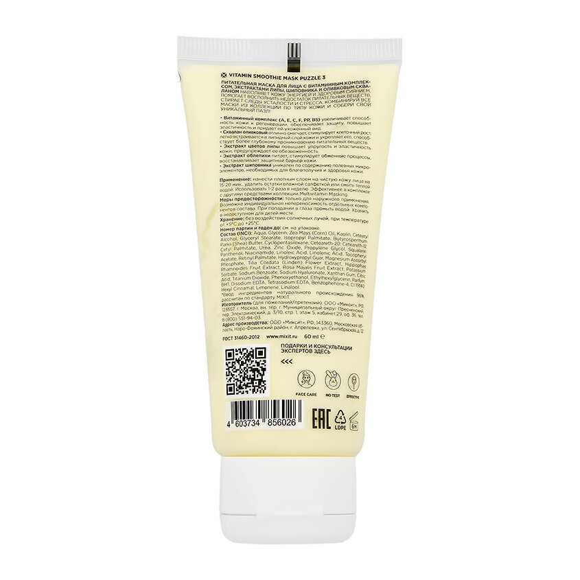 Купить MIXIT Питательная маска для лица с витаминным комплексом, экстрактами липы, шиповника и оливковым скваланом, Vitamin Smoothie Mask Puzzle 3 60 ml