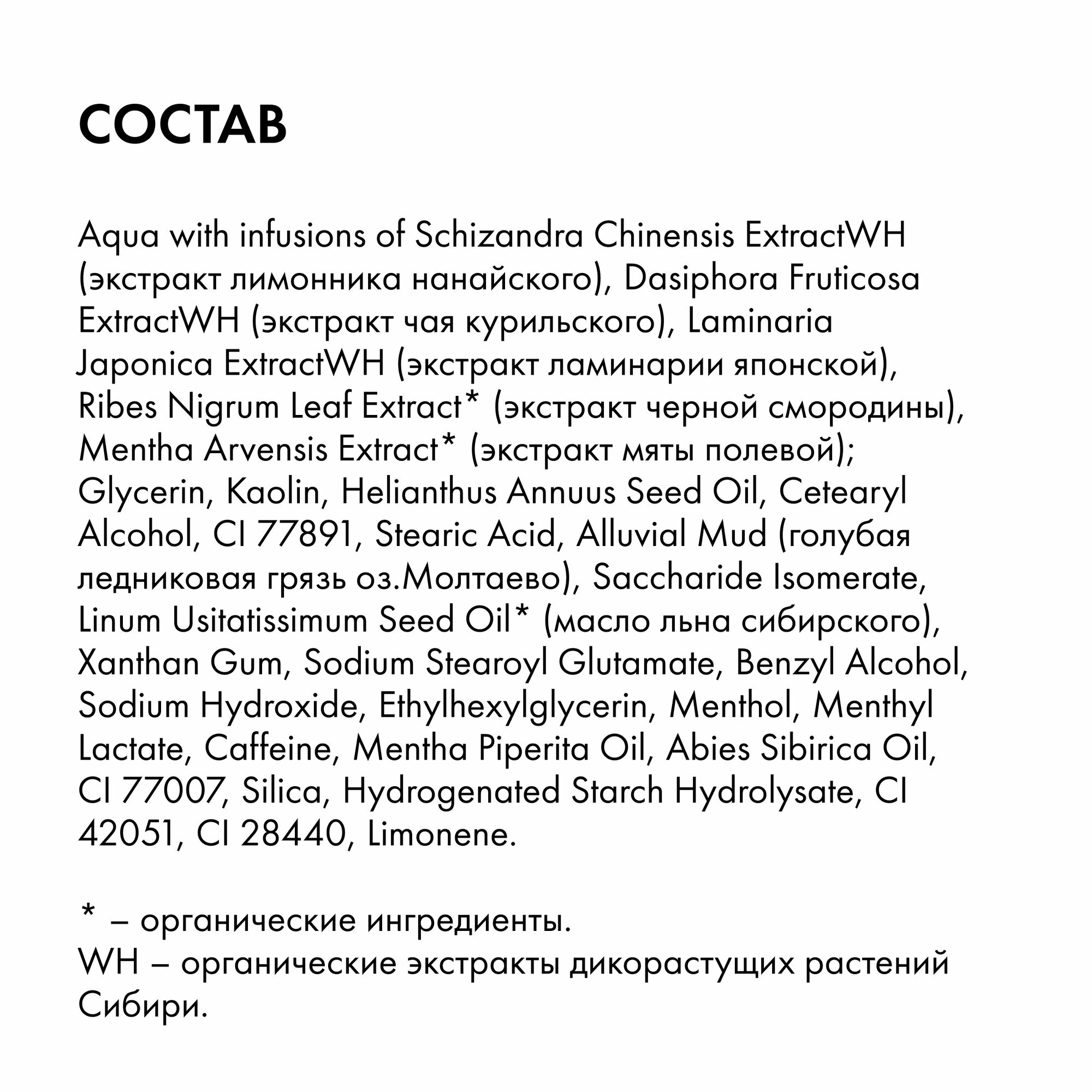 | Состав | Aqua with infusions of Schizandra Chinensis ExtractWH (экстракт лимонника нанайского), Dasiphora Fruticosa ExtractWH (экстракт чая курильского), Laminaria Japonica ExtractWH (экстракт ламинарии японской), Ribes Nigrum Leaf Extract* (экстракт черной смородины), Mentha Arvensis Extract* (экстракт мяты полевой); Glycerin, Kaolin, Helianthus Annuus Seed Oil, Cetearyl Alcohol, CI 77891, Stearic Acid, Alluvial Mud (голубая ледниковая грязь оз.Молтаево), Saccharide Isomerate, Linum Usitatissimum Seed Oil* (масло льна сибирского), Xanthan Gum, Sodium Stearoyl Glutamate, Benzyl Alcohol, Sodium Hydroxide, Ethylhexylglycerin, Menthol, Menthyl Lactate, Caffeine, Mentha Piperita Oil, Abies Sibirica Oil, CI 77007, Silica, Hydrogenated Starch Hydrolysate, CI 42051, CI 28440, Limonene. |