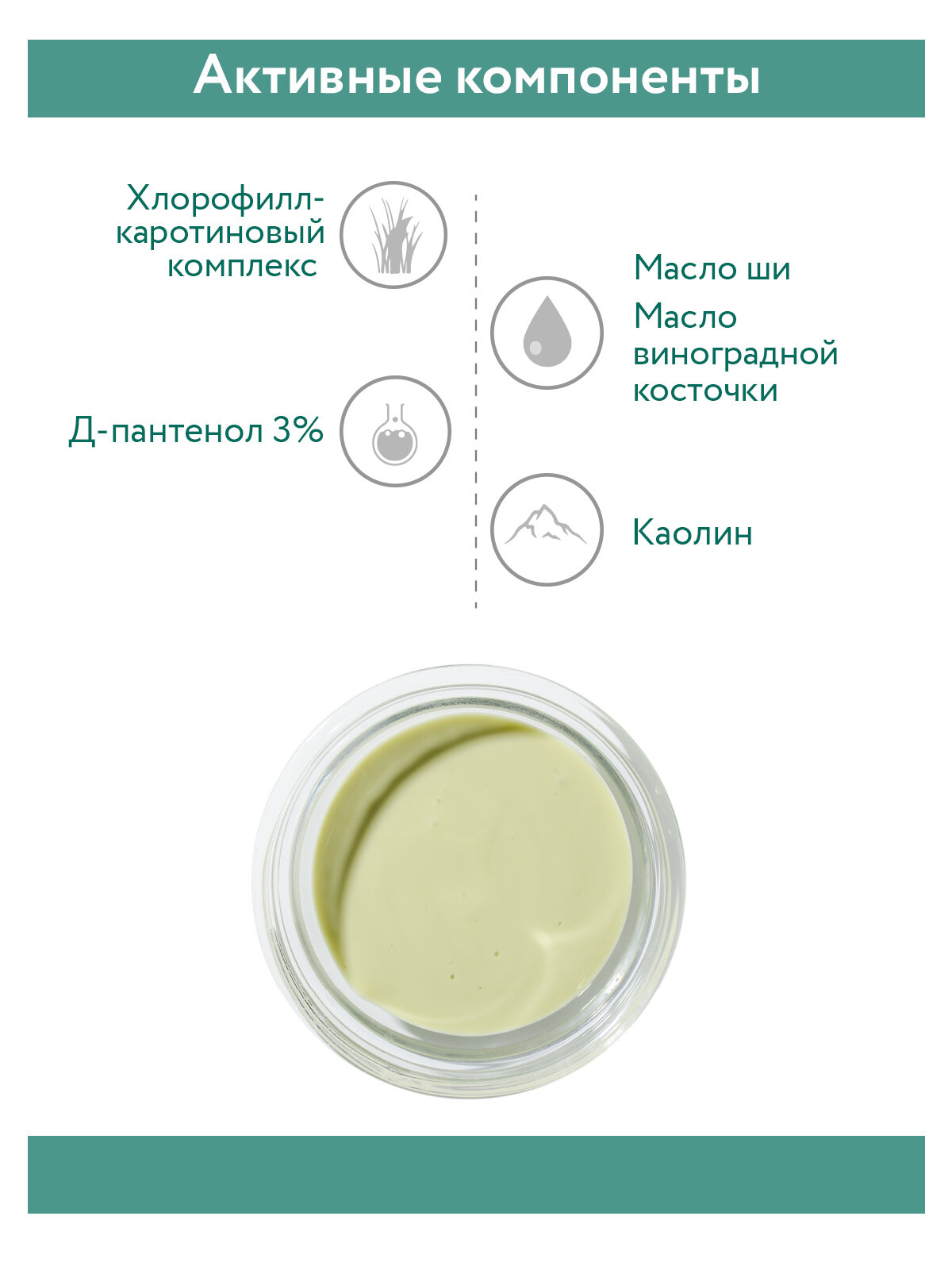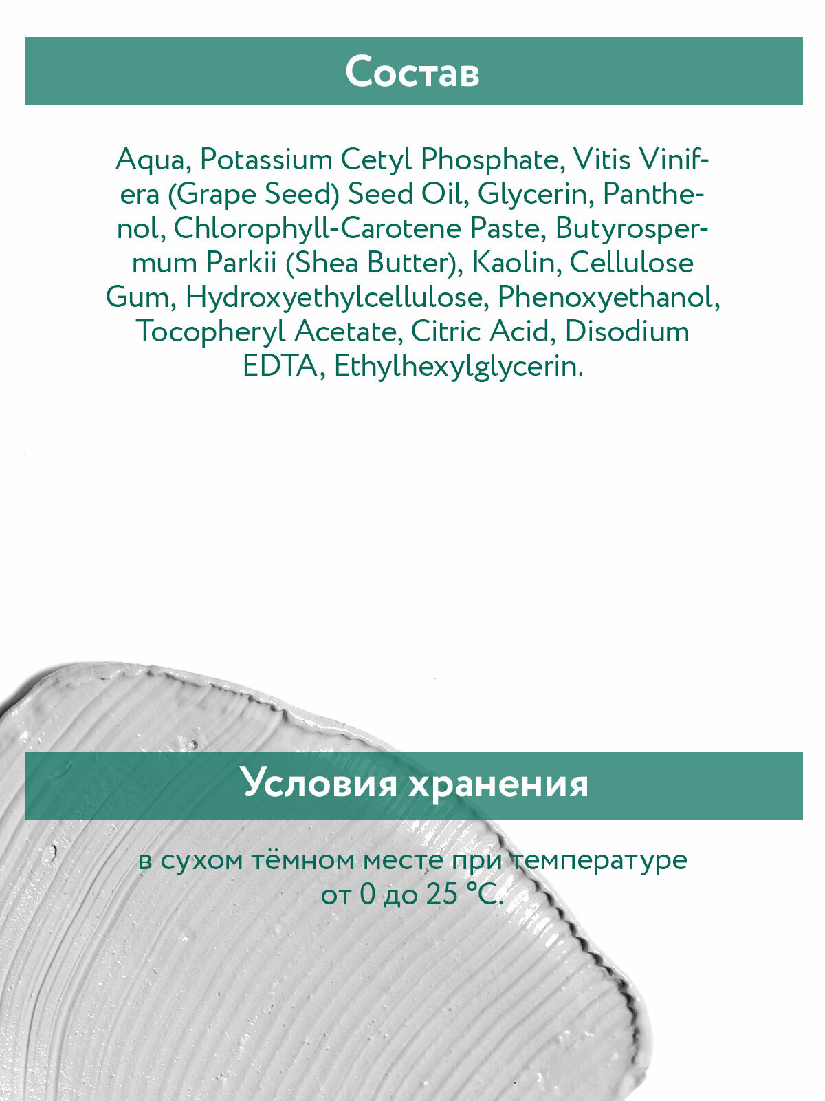 | Состав | aqua, potassium cetyl phosphate, vitis vinifera (grape seed) seed oil, glycerin, panthenol, chlorophyll-carotene paste, butyrospermum parkii (shea butter), kaolin, cellulose gum, hydroxyethylcellulose, phenoxyethanol, tocopheryl acetate, citric acid, disodium edta, ethylhexylglycerin |